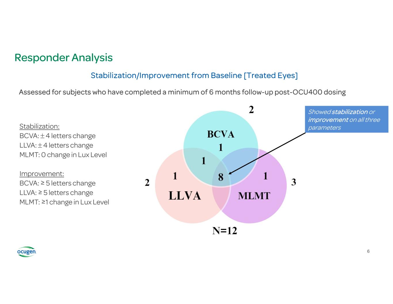 Responder Analysis Stabilization/Improvement from Baseline [Treated Eyes] Showed stabilization or improvement on all three parametersStabilization: BCVA: 4 letters change LLVA: 4 letters change MLMT: 0 change in Lux Level Improvement: BCVA: ≥ 5 letters change LLVA: ≥ 5 letters change MLMT: ≥1 change in Lux Level Assessed for subjects who have completed a minimum of 6 months follow-up post-OCU400 dosing 6