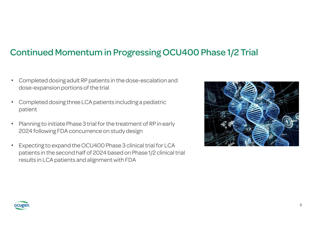 Encouraging Results from OCU400 Phase 1/2 Clinical Trial Update Results suggest gene modifier gene therapy has potential benefits in broader RP and LCA patients • OCU400 continues to demonstrate a favorable safety and tolerability profile • Clinical study update suggests continued positive trends in Best-Corrected Visual Acuity (BCVA) and Multi- Luminance Mobility Testing (MLMT), as well as positive trends in Low-Luminance Visual Acuity (LLVA) among treated eyes • 83% (10/12) of subjects demonstrated stabilization or improvement in the treated eye either on BCVA or LLVA or MLMT scores from baseline • 75% (9/12) of subjects demonstrated stabilization or improvement in treated eyes in MLMT scores from baseline • 86% (6/7) of RHO mutation subjects experienced either stabilization or improvement in MLMT scores from baseline, among which 29% (2/7) demonstrated 3 Lux luminance level improvement • Treatment effect in RHO patients—a disease affecting more than 10,000 people in the U.S. alone– supports the gene-agnostic mechanism of action of OCU400 7