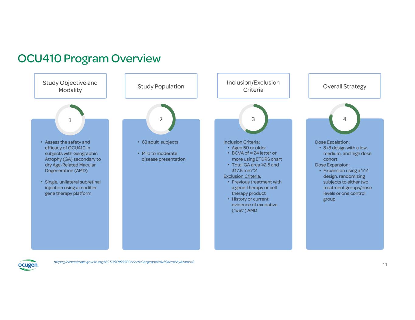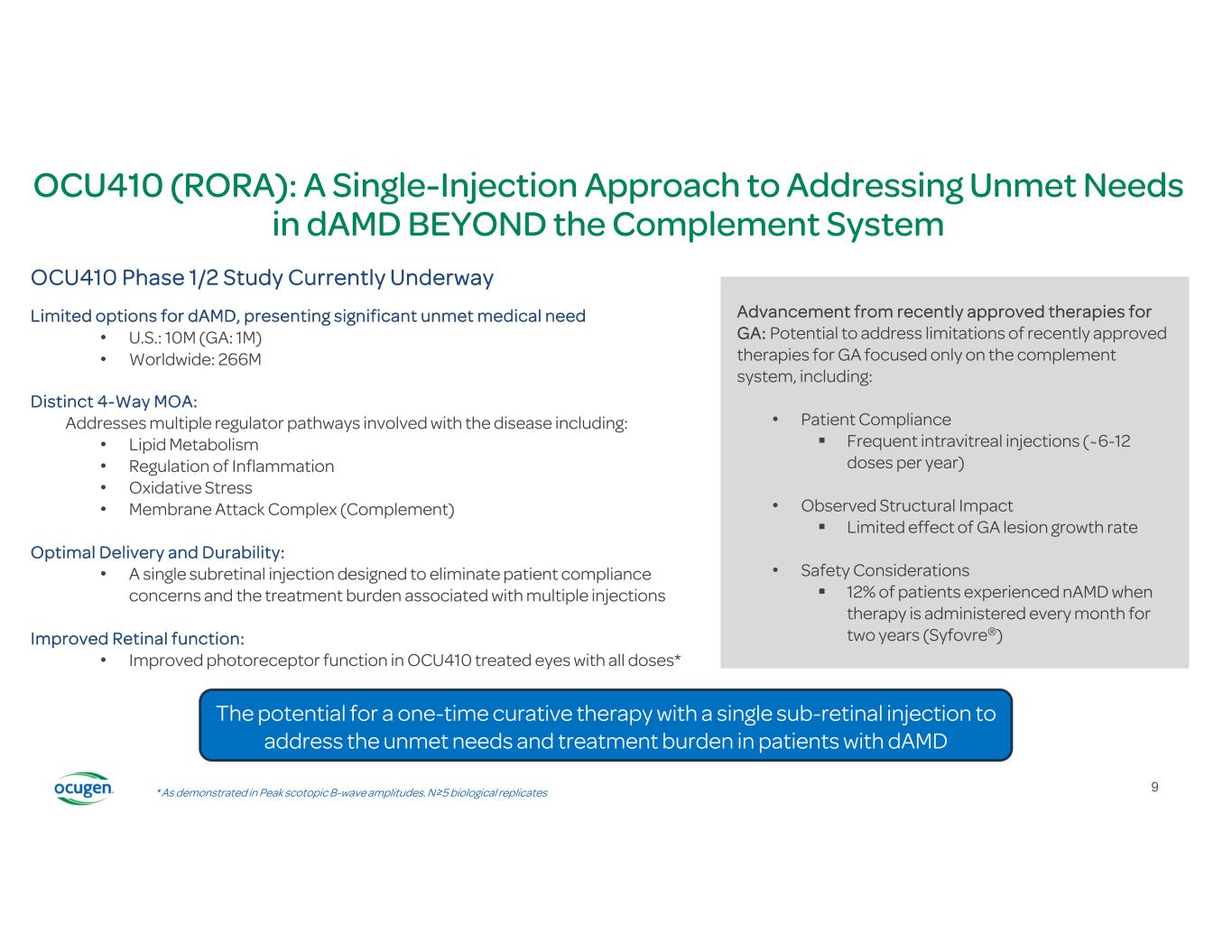 * As demonstrated in Peak scotopic B-wave amplitudes. N≥5 biological replicates Advancement from recently approved therapies for GA: Potential to address limitations of recently approved therapies for GA focused only on the complement system, including: • Patient Compliance  Frequent intravitreal injections (~6-12 doses per year) • Observed Structural Impact  Limited effect of GA lesion growth rate • Safety Considerations  12% of patients experienced nAMD when therapy is administered every month for two years (Syfovre®) OCU410 Phase 1/2 Study Currently Underway Limited options for dAMD, presenting significant unmet medical need • U.S.: 10M (GA: 1M) • Worldwide: 266M Distinct 4-Way MOA: Addresses multiple regulator pathways involved with the disease including: • Lipid Metabolism • Regulation of Inflammation • Oxidative Stress • Membrane Attack Complex (Complement) Optimal Delivery and Durability: • A single subretinal injection designed to eliminate patient compliance concerns and the treatment burden associated with multiple injections Improved Retinal function: • Improved photoreceptor function in OCU410 treated eyes with all doses* The potential for a one-time curative therapy with a single sub-retinal injection to address the unmet needs and treatment burden in patients with dAMD OCU410 (RORA): A Single-Injection Approach to Addressing Unmet Needs in dAMD BEYOND the Complement System 9