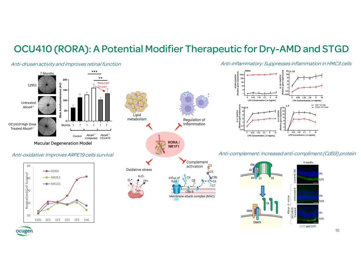 50 60 70 80 90 1e61E51E41E31E2Cells N or m al iz ed C el l S ur vi va l RORA NR2E3 NR1D1 Anti-oxidative: Improves ARPE19 cells survival Anti-complement: Increased anti-compliment (Cd59) protein Anti-inflammatory: Suppresses inflammation in HMC3 cellsAnti-drusen activity and improves retinal function ✱✱ ✱✱✱ Macular Degeneration Model Reduced Drusen OCU410 (RORA): A Potential Modifier Therapeutic for Dry-AMD and STGD 10