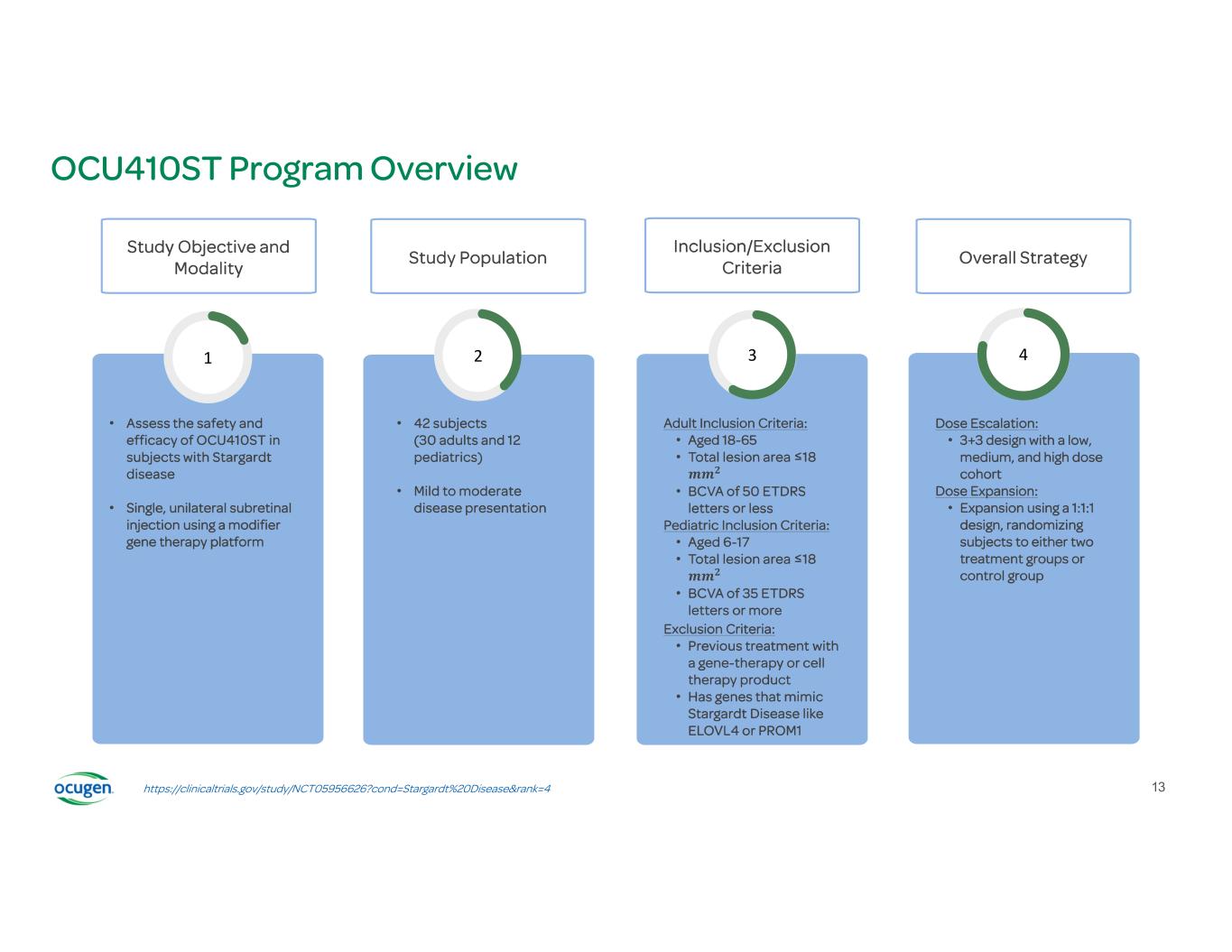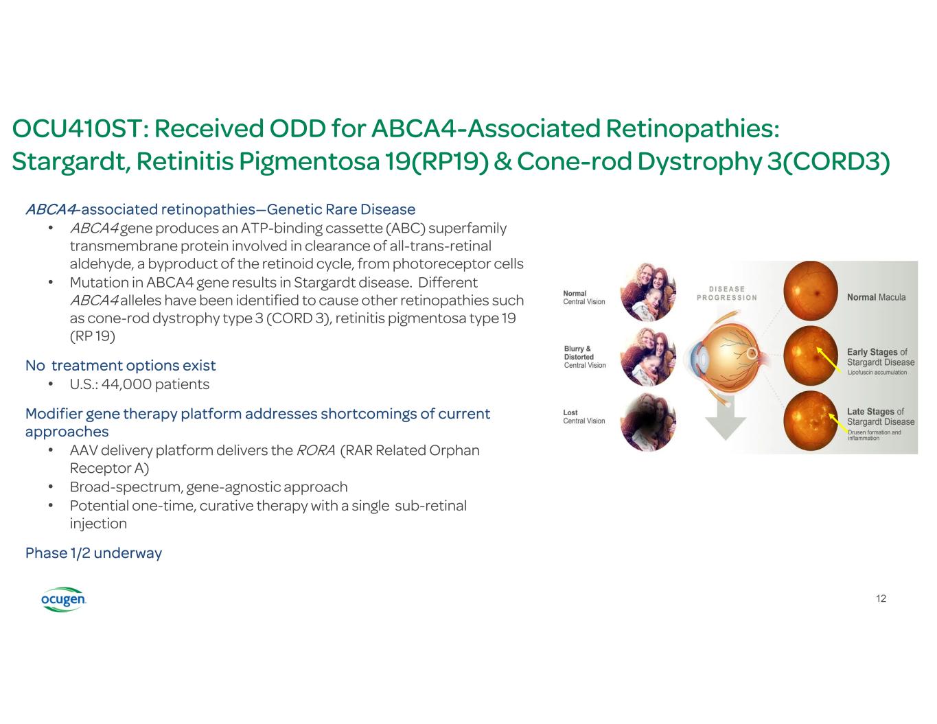 OCU410ST: Received ODD for ABCA4-Associated Retinopathies: Stargardt, Retinitis Pigmentosa 19(RP19) & Cone-rod Dystrophy 3(CORD3) ABCA4-associated retinopathies—Genetic Rare Disease • ABCA4 gene produces an ATP-binding cassette (ABC) superfamily transmembrane protein involved in clearance of all-trans-retinal aldehyde, a byproduct of the retinoid cycle, from photoreceptor cells • Mutation in ABCA4 gene results in Stargardt disease. Different ABCA4 alleles have been identified to cause other retinopathies such as cone-rod dystrophy type 3 (CORD 3), retinitis pigmentosa type 19 (RP 19) No treatment options exist • U.S.: 44,000 patients Modifier gene therapy platform addresses shortcomings of current approaches • AAV delivery platform delivers the RORA (RAR Related Orphan Receptor A) • Broad-spectrum, gene-agnostic approach • Potential one-time, curative therapy with a single sub-retinal injection Phase 1/2 underway 12