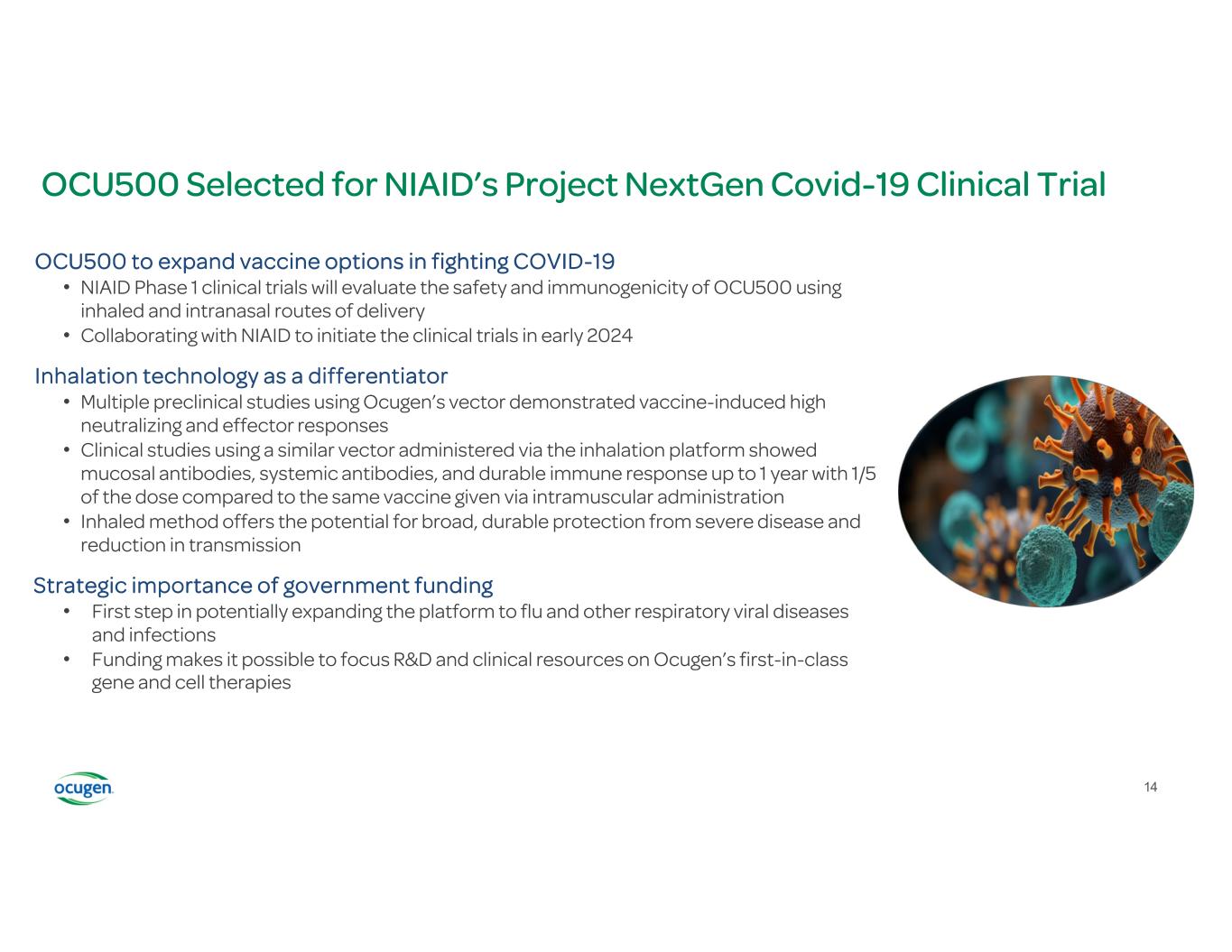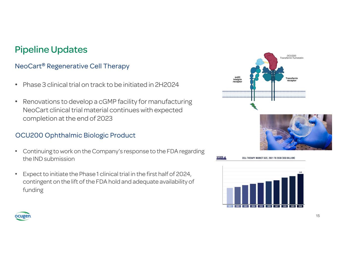 OCU500 Selected for NIAID’s Project NextGen Covid-19 Clinical Trial OCU500 to expand vaccine options in fighting COVID-19 • NIAID Phase 1 clinical trials will evaluate the safety and immunogenicity of OCU500 using inhaled and intranasal routes of delivery • Collaborating with NIAID to initiate the clinical trials in early 2024 Inhalation technology as a differentiator • Multiple preclinical studies using Ocugen’s vector demonstrated vaccine-induced high neutralizing and effector responses • Clinical studies using a similar vector administered via the inhalation platform showed mucosal antibodies, systemic antibodies, and durable immune response up to 1 year with 1/5 of the dose compared to the same vaccine given via intramuscular administration • Inhaled method offers the potential for broad, durable protection from severe disease and reduction in transmission Strategic importance of government funding • First step in potentially expanding the platform to flu and other respiratory viral diseases and infections • Funding makes it possible to focus R&D and clinical resources on Ocugen’s first-in-class gene and cell therapies 14
