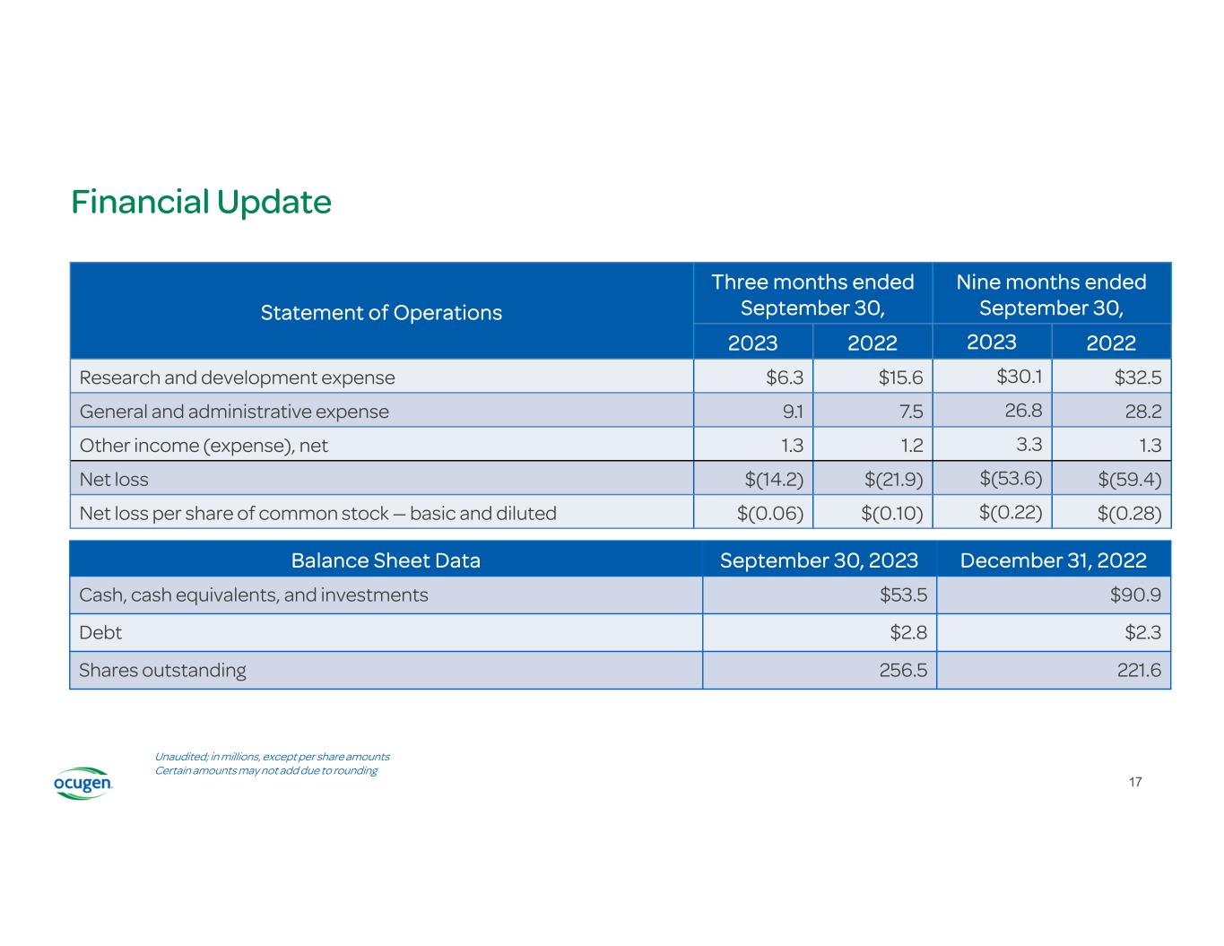 Financial Update Nine months ended September 30, Three months ended September 30,Statement of Operations 2022202320222023 $32.5$30.1$15.6$6.3Research and development expense 28.226.87.59.1General and administrative expense 1.33.31.21.3Other income (expense), net $(59.4)$(53.6)$(21.9)$(14.2)Net loss $(0.28)$(0.22)$(0.10)$(0.06)Net loss per share of common stock — basic and diluted December 31, 2022September 30, 2023Balance Sheet Data $90.9$53.5Cash, cash equivalents, and investments $2.3$2.8Debt 221.6256.5Shares outstanding Unaudited; in millions, except per share amounts Certain amounts may not add due to rounding 17
