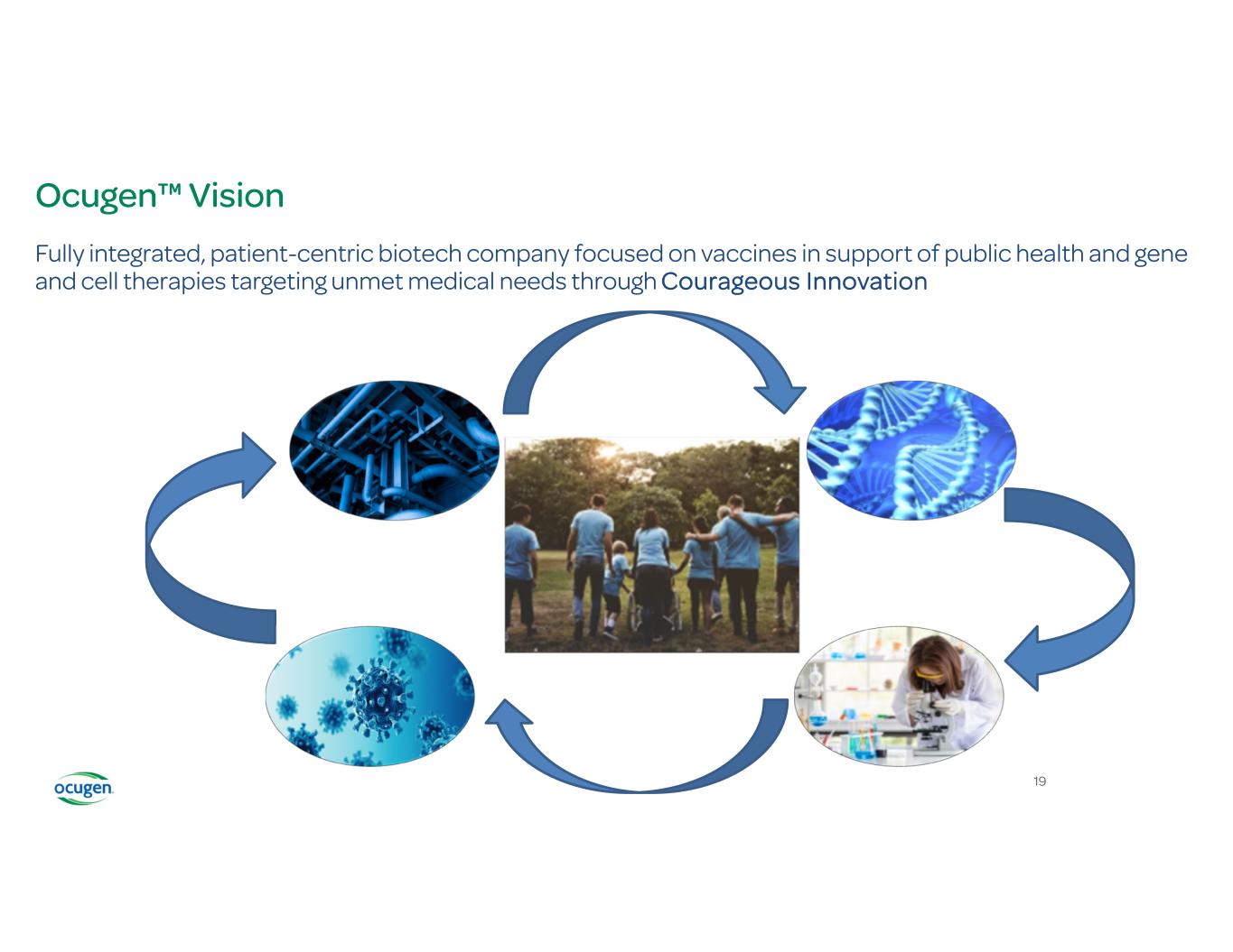 19 Ocugen™ Vision Fully integrated, patient-centric biotech company focused on vaccines in support of public health and gene and cell therapies targeting unmet medical needs through Courageous Innovation