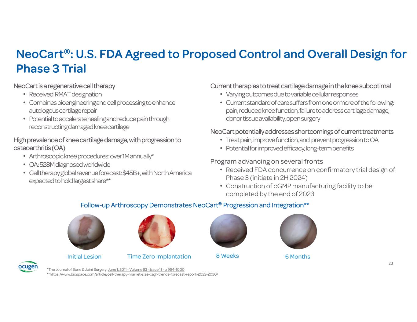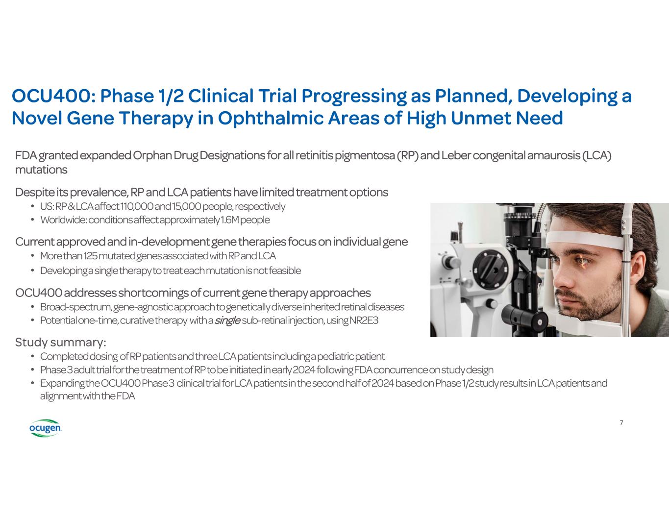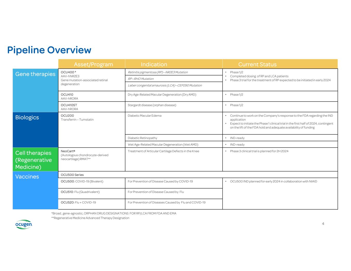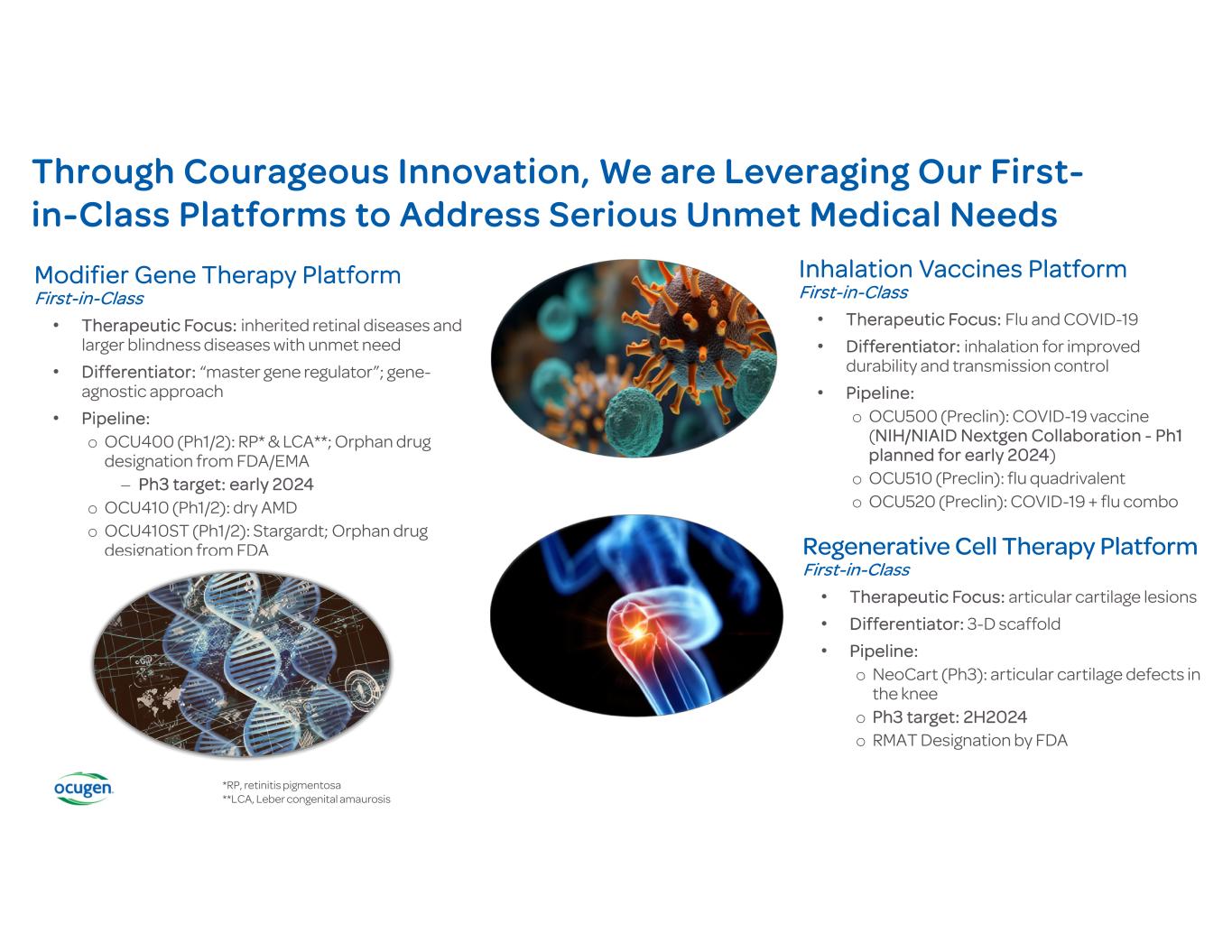 Through Courageous Innovation, We are Leveraging Our First- in-Class Platforms to Address Serious Unmet Medical Needs Modifier Gene Therapy Platform First-in-Class • Therapeutic Focus: inherited retinal diseases and larger blindness diseases with unmet need • Differentiator: “master gene regulator”; gene- agnostic approach • Pipeline: o OCU400 (Ph1/2): RP* & LCA**; Orphan drug designation from FDA/EMA ⎼ Ph3 target: early 2024 o OCU410 (Ph1/2): dry AMD o OCU410ST (Ph1/2): Stargardt; Orphan drug designation from FDA Inhalation Vaccines Platform First-in-Class • Therapeutic Focus: Flu and COVID-19 • Differentiator: inhalation for improved durability and transmission control • Pipeline: o OCU500 (Preclin): COVID-19 vaccine (NIH/NIAID Nextgen Collaboration - Ph1 planned for early 2024) o OCU510 (Preclin): flu quadrivalent o OCU520 (Preclin): COVID-19 + flu combo Regenerative Cell Therapy Platform First-in-Class • Therapeutic Focus: articular cartilage lesions • Differentiator: 3-D scaffold • Pipeline: o NeoCart (Ph3): articular cartilage defects in the knee o Ph3 target: 2H2024 o RMAT Designation by FDA *RP, retinitis pigmentosa **LCA, Leber congenital amaurosis