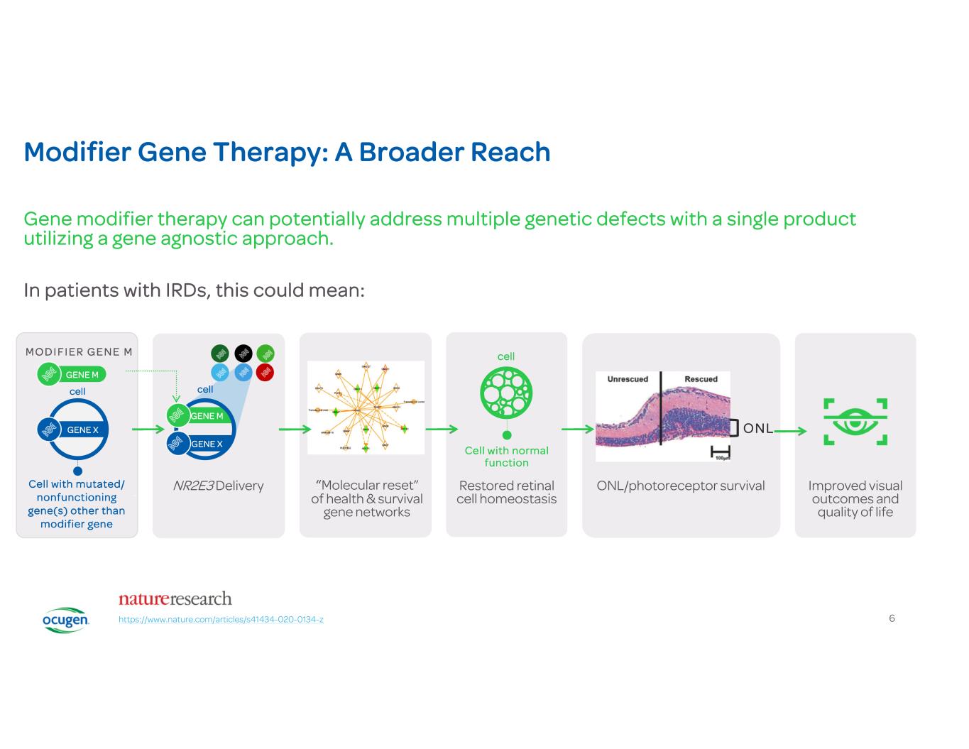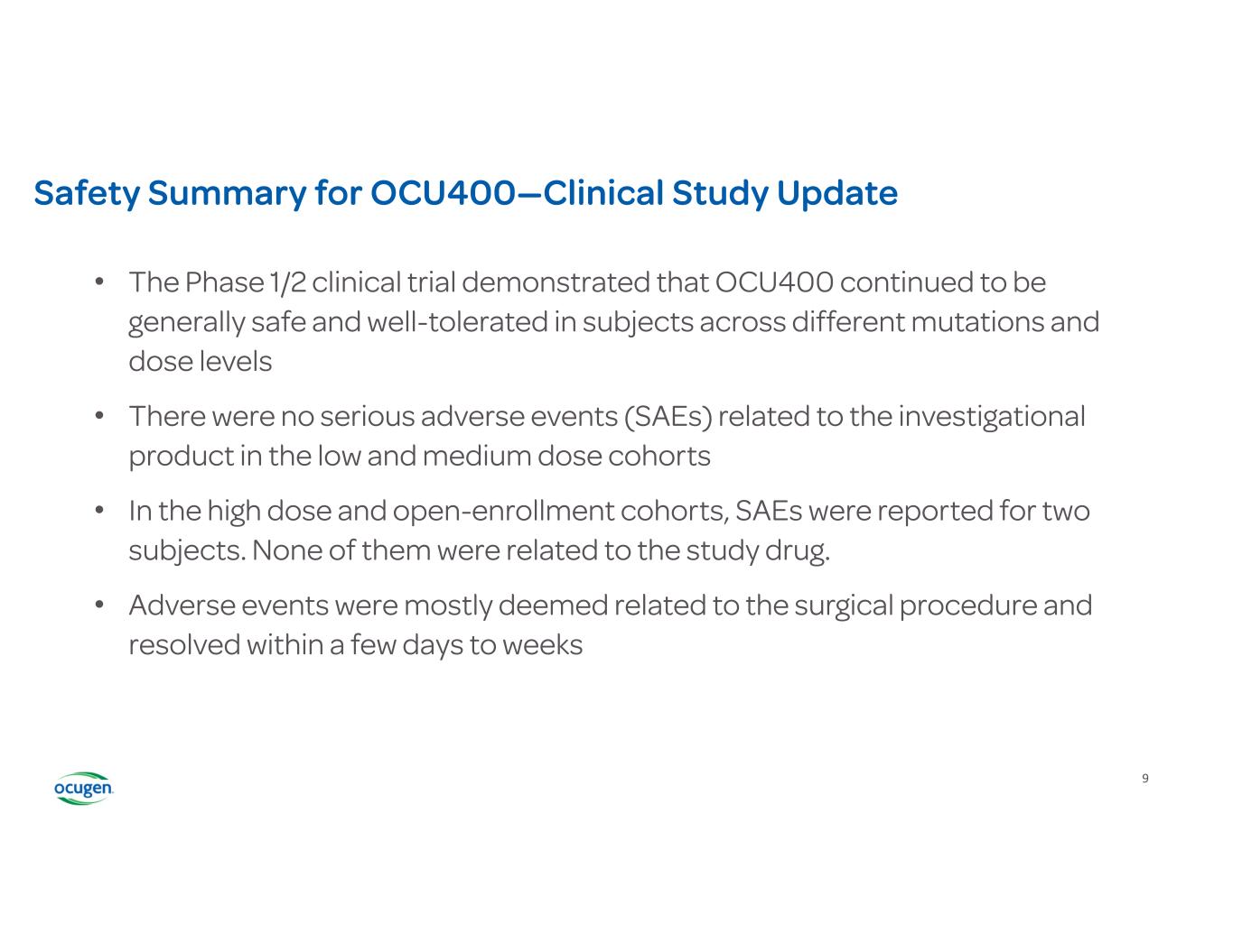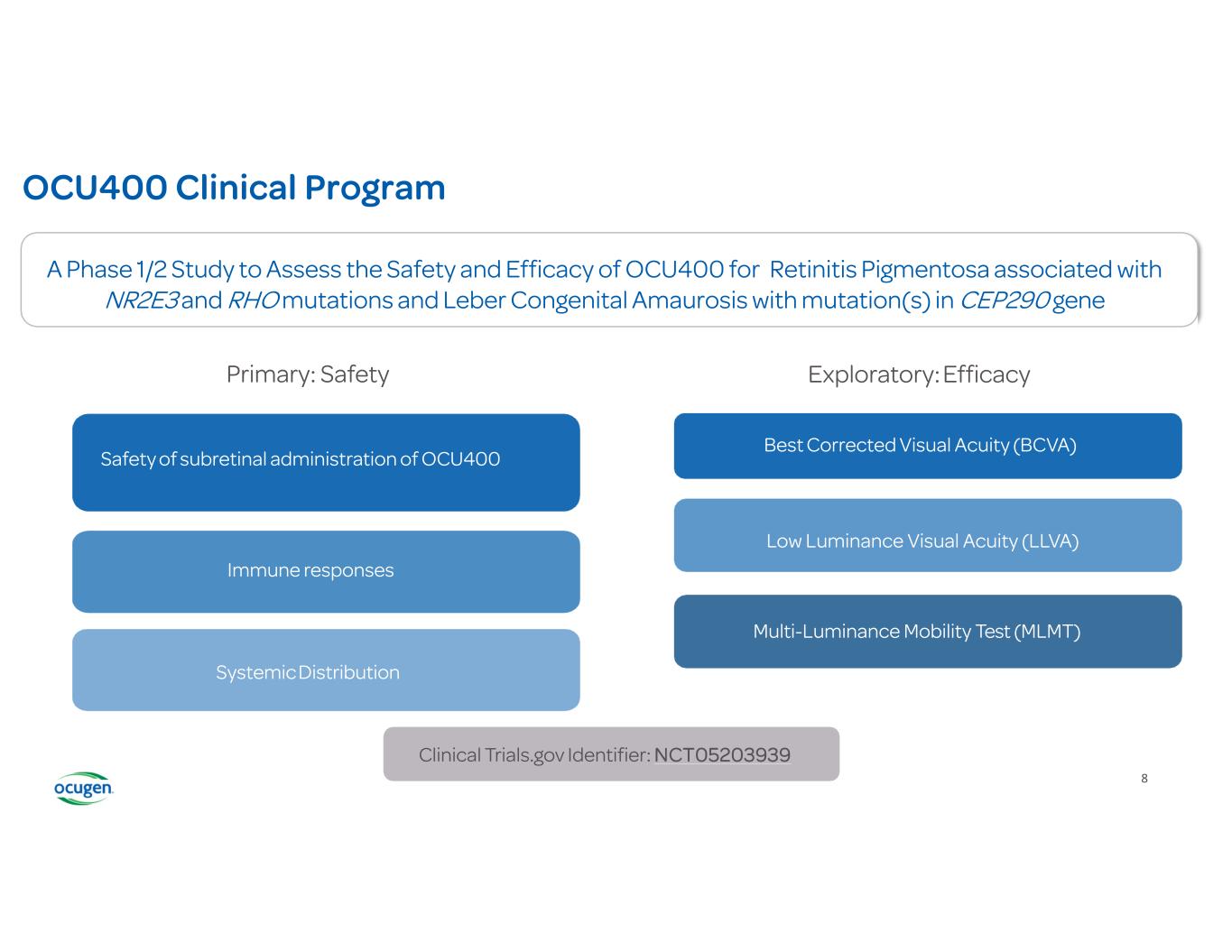 OCU400 Clinical Program A Phase 1/2 Study to Assess the Safety and Efficacy of OCU400 for Retinitis Pigmentosa associated with NR2E3 and RHO mutations and Leber Congenital Amaurosis with mutation(s) in CEP290 gene Clinical Trials.gov Identifier: NCT05203939 Safety of subretinal administration of OCU400 Immune responses Systemic Distribution Best Corrected Visual Acuity (BCVA) Multi-Luminance Mobility Test (MLMT) Low Luminance Visual Acuity (LLVA) Primary: Safety Exploratory: Efficacy 48