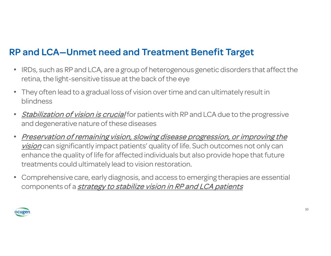 RP and LCA—Unmet need and Treatment Benefit Target 8 • IRDs, such as RP and LCA, are a group of heterogenous genetic disorders that affect the retina, the light-sensitive tissue at the back of the eye • They often lead to a gradual loss of vision over time and can ultimately result in blindness • Stabilization of vision is crucial for patients with RP and LCA due to the progressive and degenerative nature of these diseases • Preservation of remaining vision, slowing disease progression, or improving the vision can significantly impact patients’ quality of life. Such outcomes not only can enhance the quality of life for affected individuals but also provide hope that future treatments could ultimately lead to vision restoration. • Comprehensive care, early diagnosis, and access to emerging therapies are essential components of a strategy to stabilize vision in RP and LCA patients 10