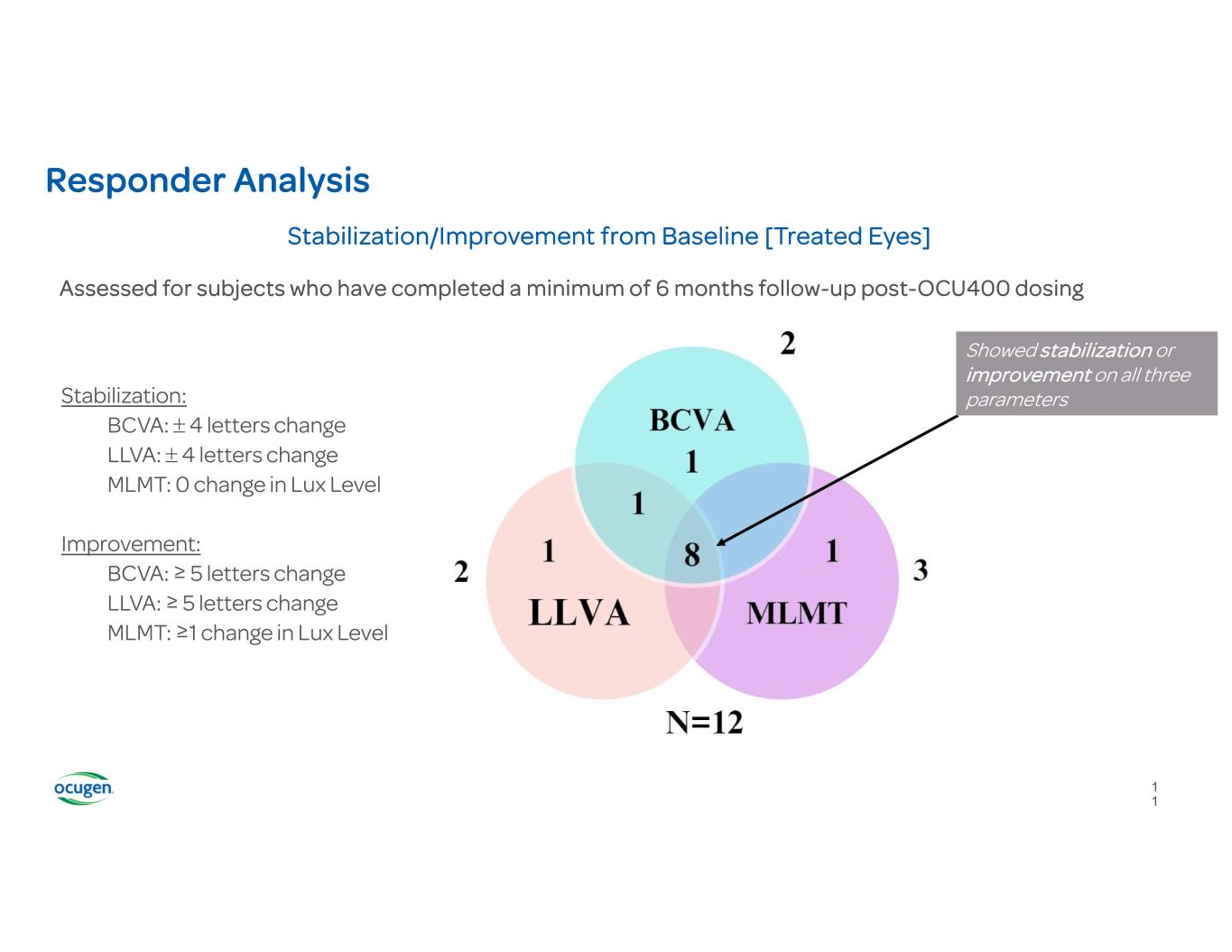 Responder Analysis Stabilization/Improvement from Baseline [Treated Eyes] Showed stabilization or improvement on all three parametersStabilization: BCVA: 4 letters change LLVA: 4 letters change MLMT: 0 change in Lux Level Improvement: BCVA: ≥ 5 letters change LLVA: ≥ 5 letters change MLMT: ≥1 change in Lux Level Assessed for subjects who have completed a minimum of 6 months follow-up post-OCU400 dosing 1 1