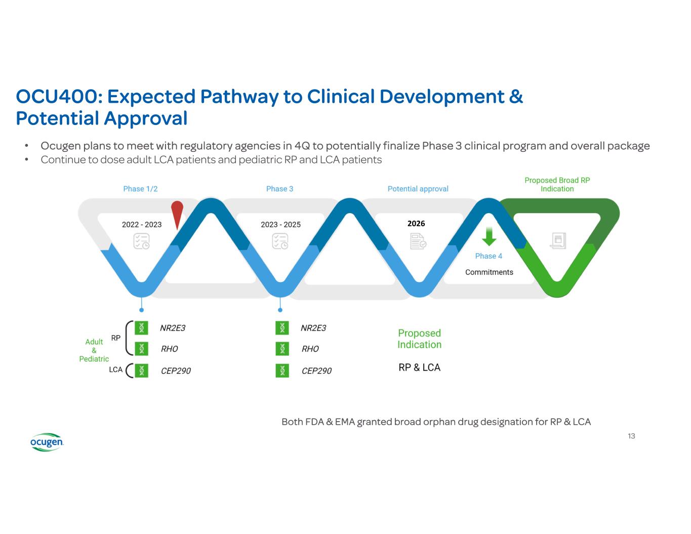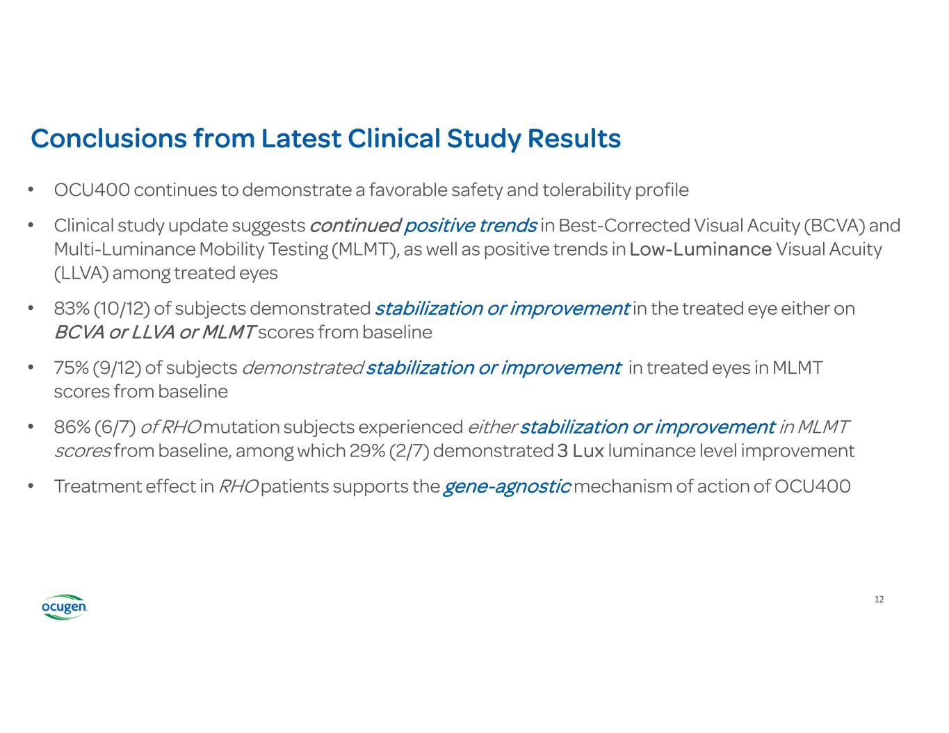 Conclusions from Latest Clinical Study Results • OCU400 continues to demonstrate a favorable safety and tolerability profile • Clinical study update suggests continued positive trends in Best-Corrected Visual Acuity (BCVA) and Multi-Luminance Mobility Testing (MLMT), as well as positive trends in Low-Luminance Visual Acuity (LLVA) among treated eyes • 83% (10/12) of subjects demonstrated stabilization or improvement in the treated eye either on BCVA or LLVA or MLMT scores from baseline • 75% (9/12) of subjects demonstrated stabilization or improvement in treated eyes in MLMT scores from baseline • 86% (6/7) of RHO mutation subjects experienced either stabilization or improvement in MLMT scores from baseline, among which 29% (2/7) demonstrated 3 Lux luminance level improvement • Treatment effect in RHO patients supports the gene-agnostic mechanism of action of OCU400 12 12