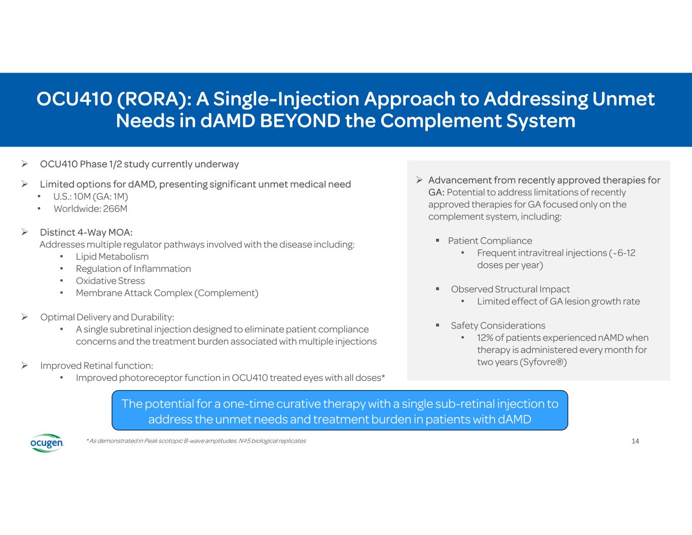 OCU400: Expected Pathway to Clinical Development & Potential Approval Both FDA & EMA granted broad orphan drug designation for RP & LCA • Ocugen plans to meet with regulatory agencies in 4Q to potentially finalize Phase 3 clinical program and overall package • Continue to dose adult LCA patients and pediatric RP and LCA patients 13 2026