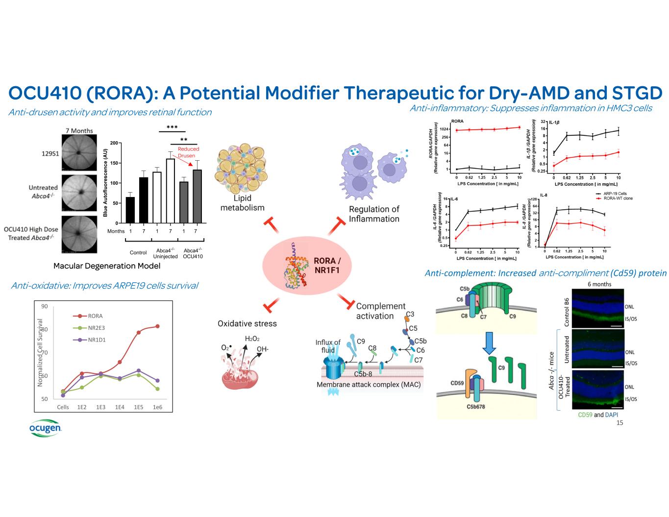 * As demonstrated in Peak scotopic B-wave amplitudes. N≥5 biological replicates 14  Advancement from recently approved therapies for GA: Potential to address limitations of recently approved therapies for GA focused only on the complement system, including:  Patient Compliance • Frequent intravitreal injections (~6-12 doses per year)  Observed Structural Impact • Limited effect of GA lesion growth rate  Safety Considerations • 12% of patients experienced nAMD when therapy is administered every month for two years (Syfovre®)  OCU410 Phase 1/2 study currently underway  Limited options for dAMD, presenting significant unmet medical need • U.S.: 10M (GA: 1M) • Worldwide: 266M  Distinct 4-Way MOA: Addresses multiple regulator pathways involved with the disease including: • Lipid Metabolism • Regulation of Inflammation • Oxidative Stress • Membrane Attack Complex (Complement)  Optimal Delivery and Durability: • A single subretinal injection designed to eliminate patient compliance concerns and the treatment burden associated with multiple injections  Improved Retinal function: • Improved photoreceptor function in OCU410 treated eyes with all doses* The potential for a one-time curative therapy with a single sub-retinal injection to address the unmet needs and treatment burden in patients with dAMD OCU410 (RORA): A Single-Injection Approach to Addressing Unmet Needs in dAMD BEYOND the Complement System