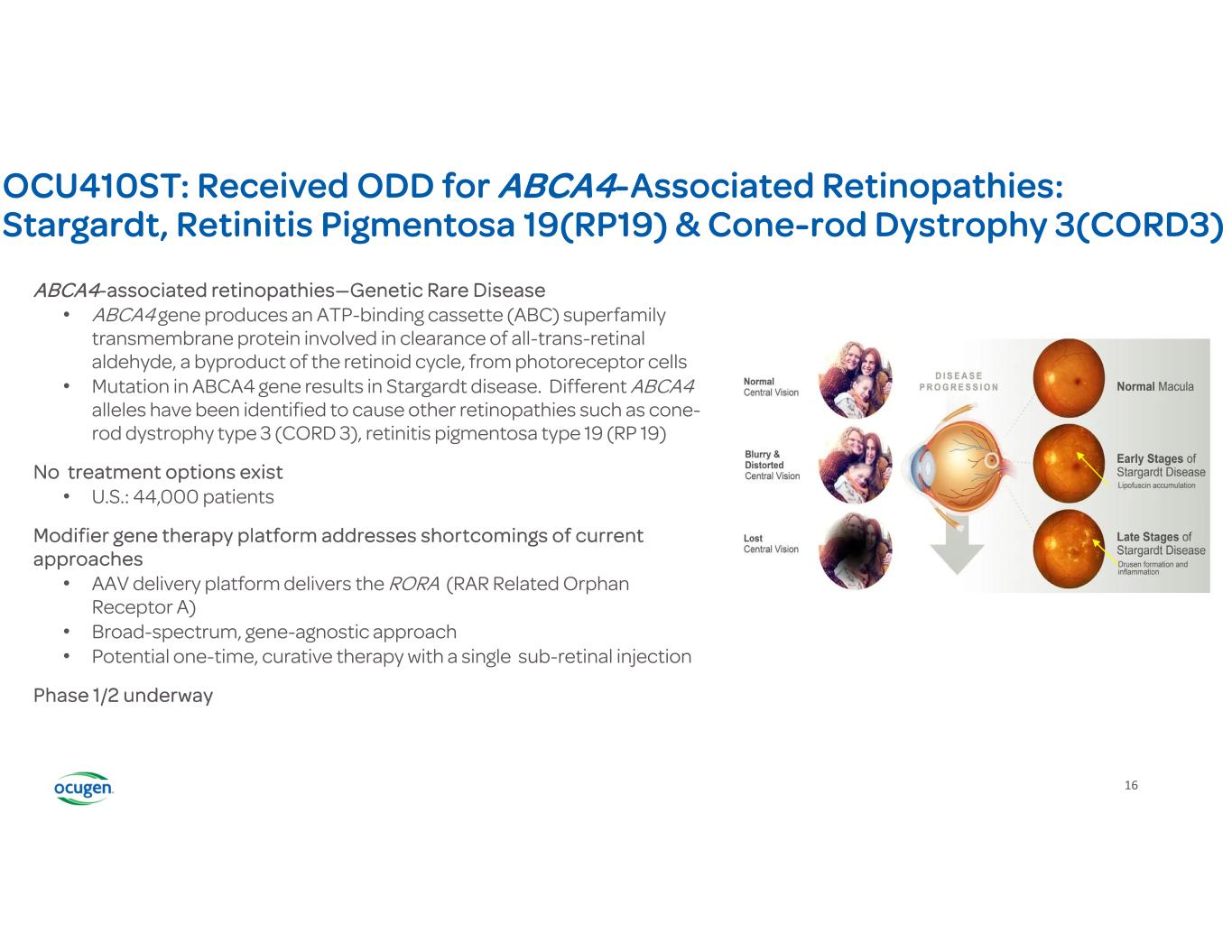 50 60 70 80 90 1e61E51E41E31E2Cells N or m al iz ed C el l S ur vi va l RORA NR2E3 NR1D1 Anti-oxidative: Improves ARPE19 cells survival Anti-complement: Increased anti-compliment (Cd59) protein Anti-inflammatory: Suppresses inflammation in HMC3 cellsAnti-drusen activity and improves retinal function 0 50 100 150 200 Months 1 7 1 7 1 7 Control Abca4-/- Uninjected Abca4-/- OCU410 ✱✱ ✱✱✱ Macular Degeneration Model Reduced Drusen 15 OCU410 (RORA): A Potential Modifier Therapeutic for Dry-AMD and STGD