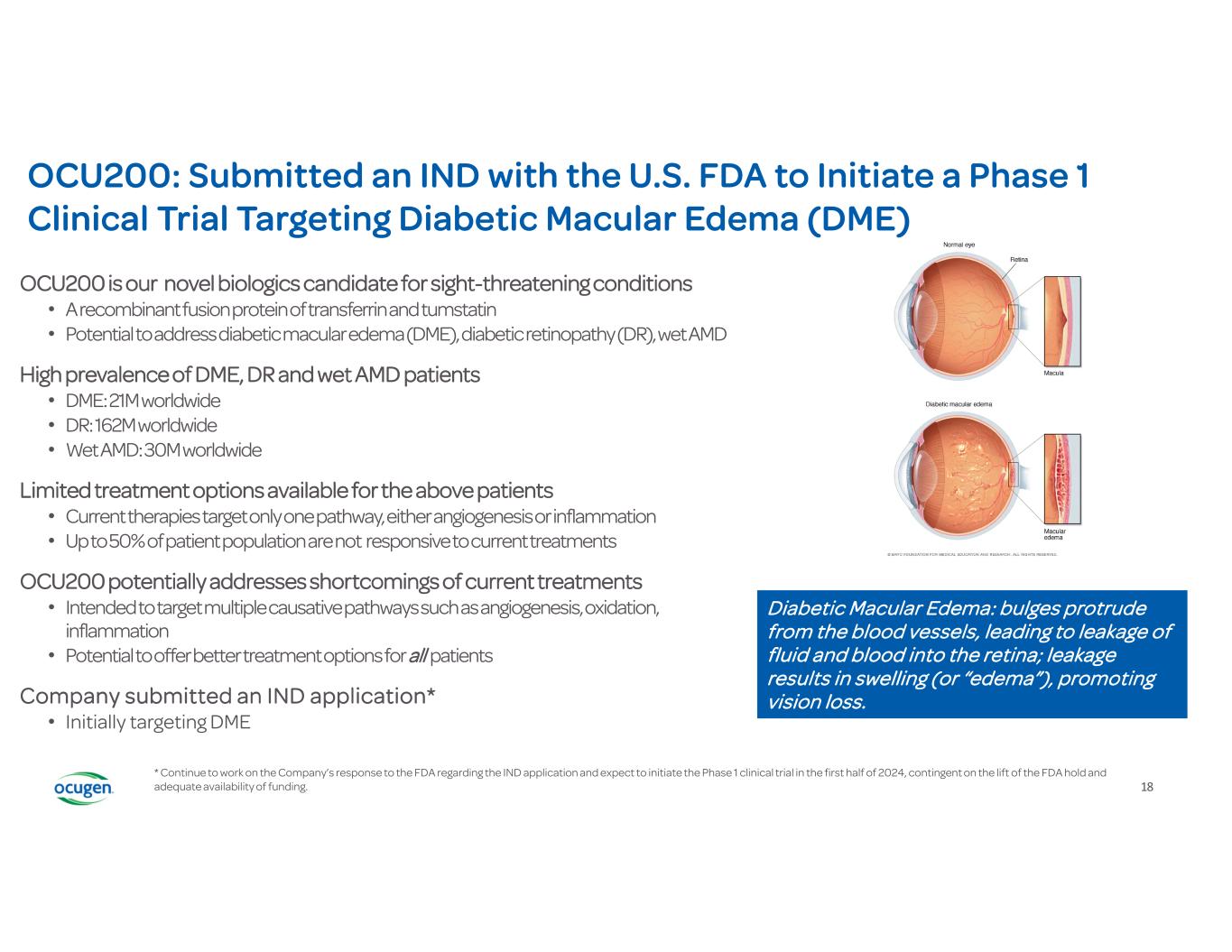 17 OCU200 Novel biologic for treating Diabetic Macular Edema (DME), Diabetic Retinopathy (DR) and Wet Age-Related Macular Degeneration (Wet AMD)