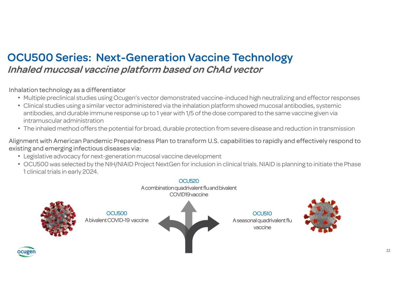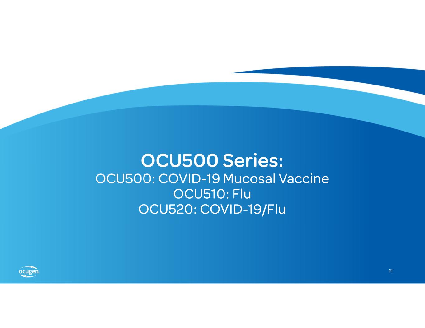 21 OCU500 Series: OCU500: COVID-19 Mucosal Vaccine OCU510: Flu OCU520: COVID-19/Flu