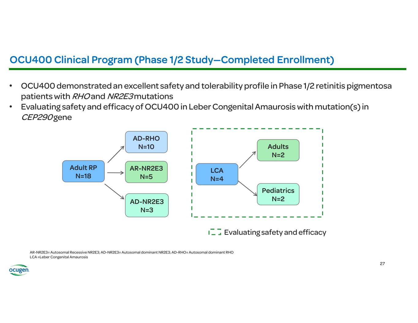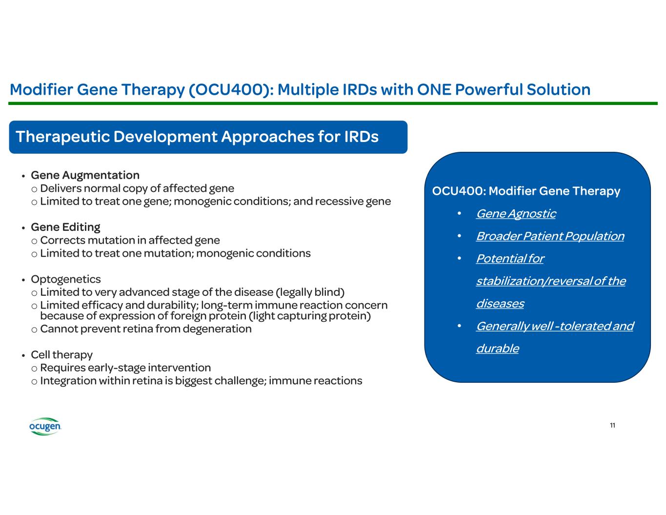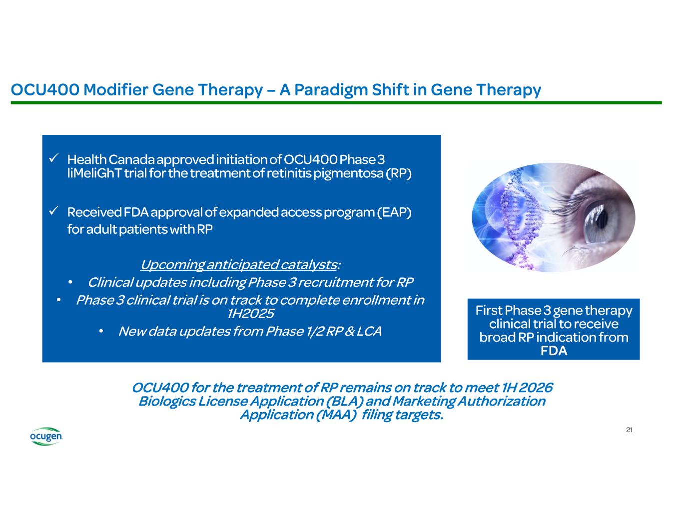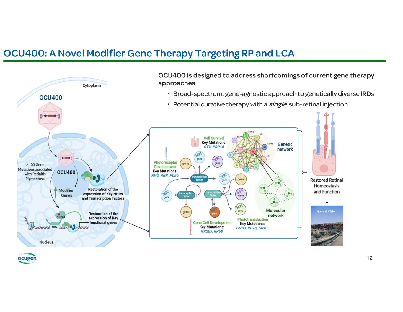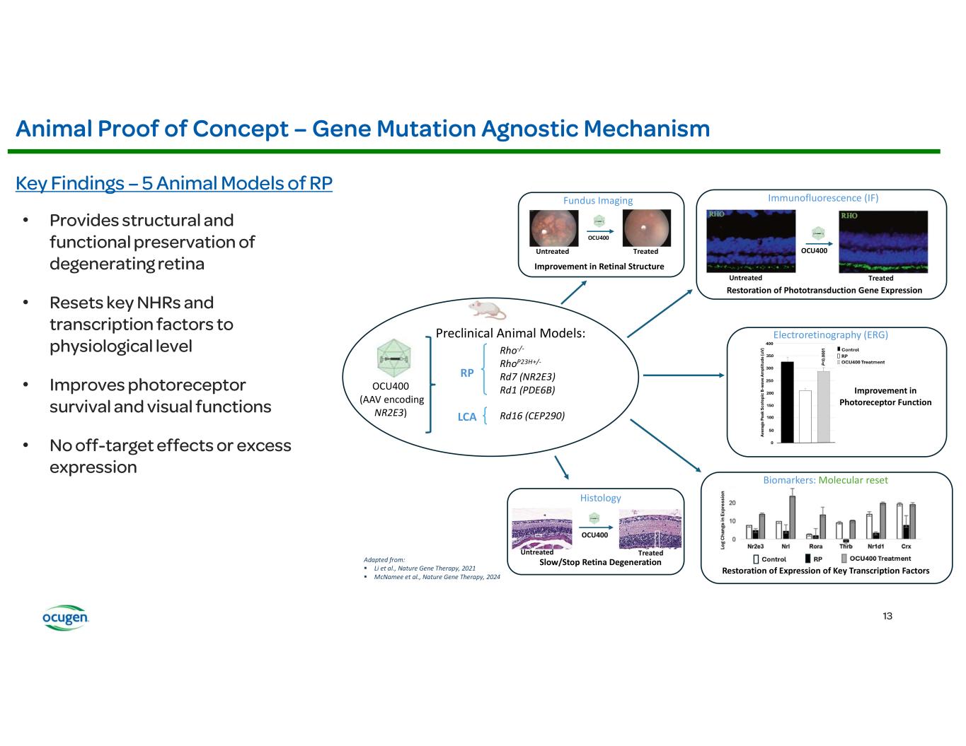 • • • • OCU400 (AAV encoding NR2E3) Rho-/- RhoP23H+/- Rd7 (NR2E3) Rd1 (PDE6B) Rd16 (CEP290) Adapted from: § Li et al., Nature Gene Therapy, 2021 § McNamee et al., Nature Gene Therapy, 2024 Fundus Imaging Improvement in Retinal Structure OCU400 Untreated Treated Histology Slow/Stop Retina Degeneration OCU400 Untreated Treated Biomarkers: Molecular reset Restoration of Expression of Key Transcription Factors Immunofluorescence (IF) Restoration of Phototransduction Gene Expression OCU400 Untreated Treated RP LCA Preclinical Animal Models: Electroretinography (ERG) Improvement in Photoreceptor Function