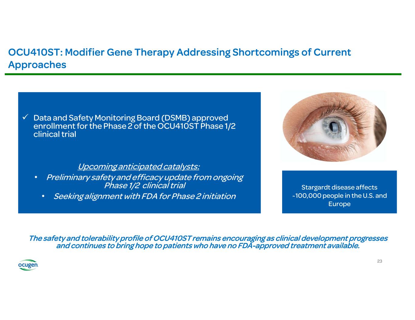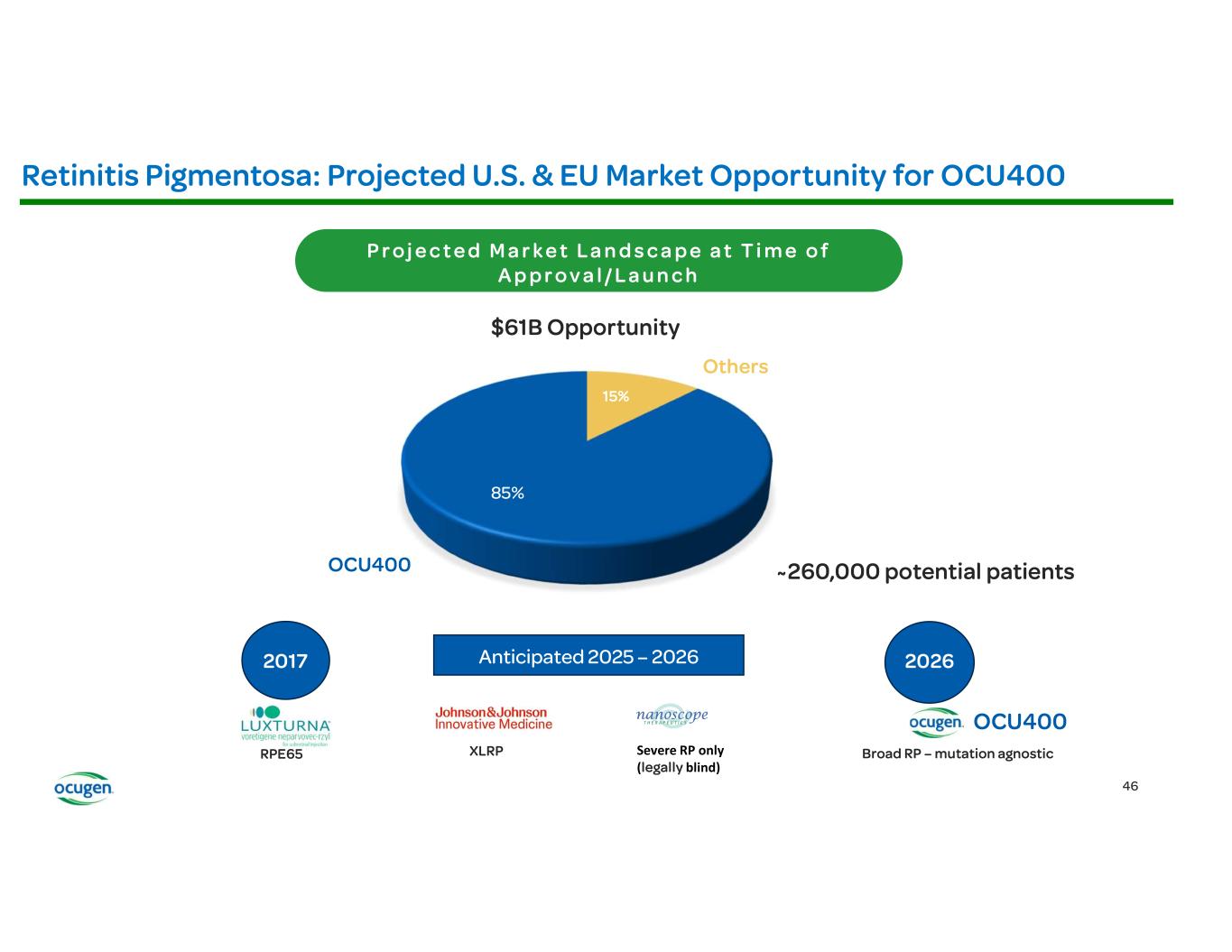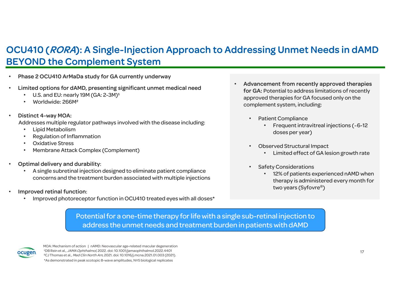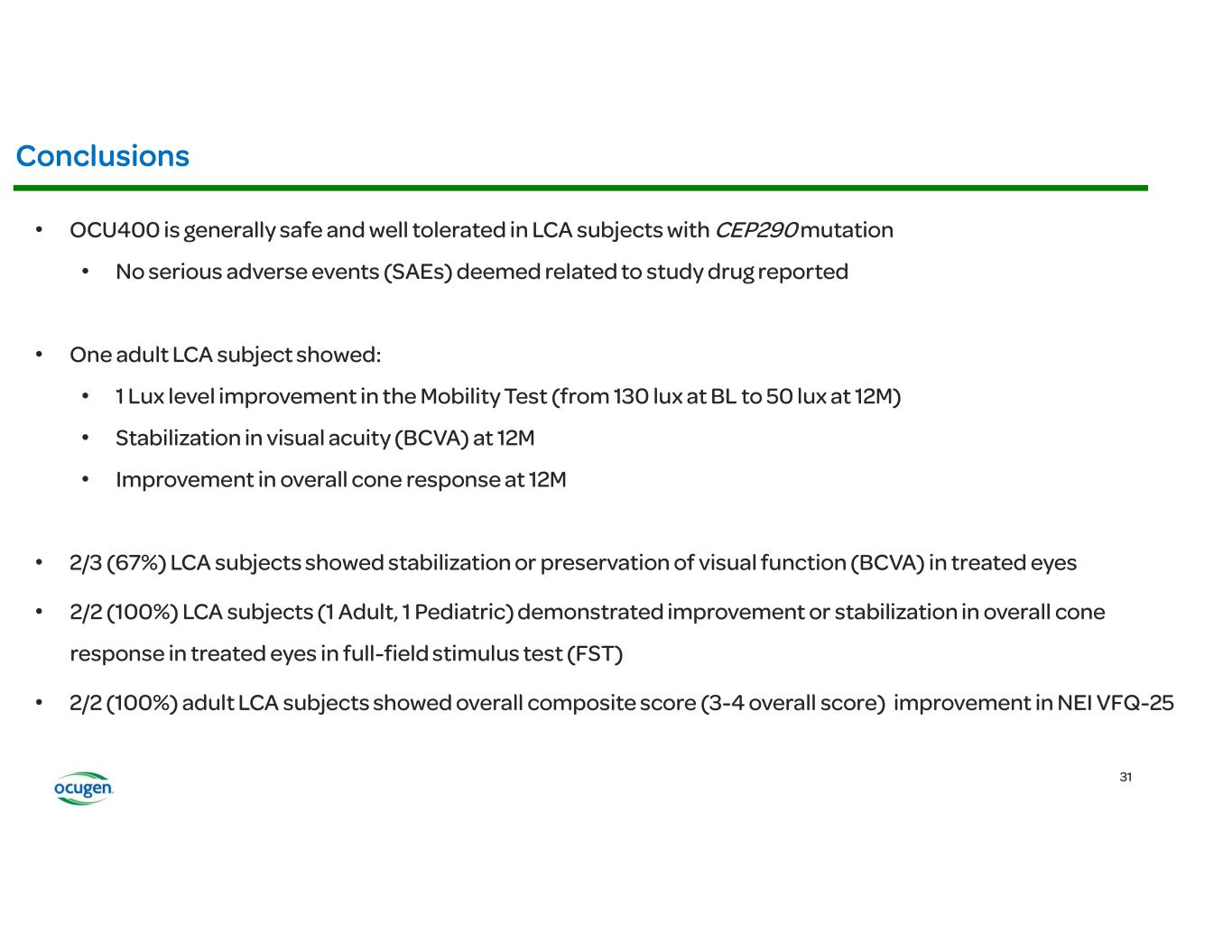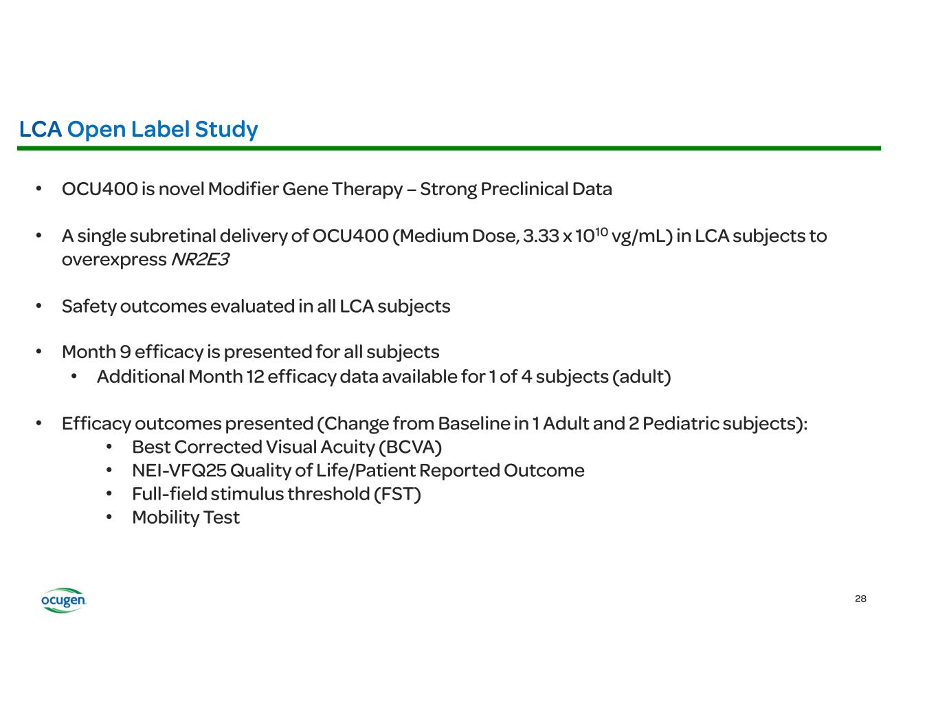 • • • • OCU400 (AAV encoding NR2E3) Rho-/- RhoP23H+/- Rd7 (NR2E3) Rd1 (PDE6B) Rd16 (CEP290) Adapted from: § Li et al., Nature Gene Therapy, 2021 § McNamee et al., Nature Gene Therapy, 2024 Fundus Imaging Improvement in Retinal Structure OCU400 Untreated Treated Histology Slow/Stop Retina Degeneration OCU400 Untreated Treated Biomarkers: Molecular reset Restoration of Expression of Key Transcription Factors Immunofluorescence (IF) Restoration of Phototransduction Gene Expression OCU400 Untreated Treated RP LCA Preclinical Animal Models: Electroretinography (ERG) Improvement in Photoreceptor Function