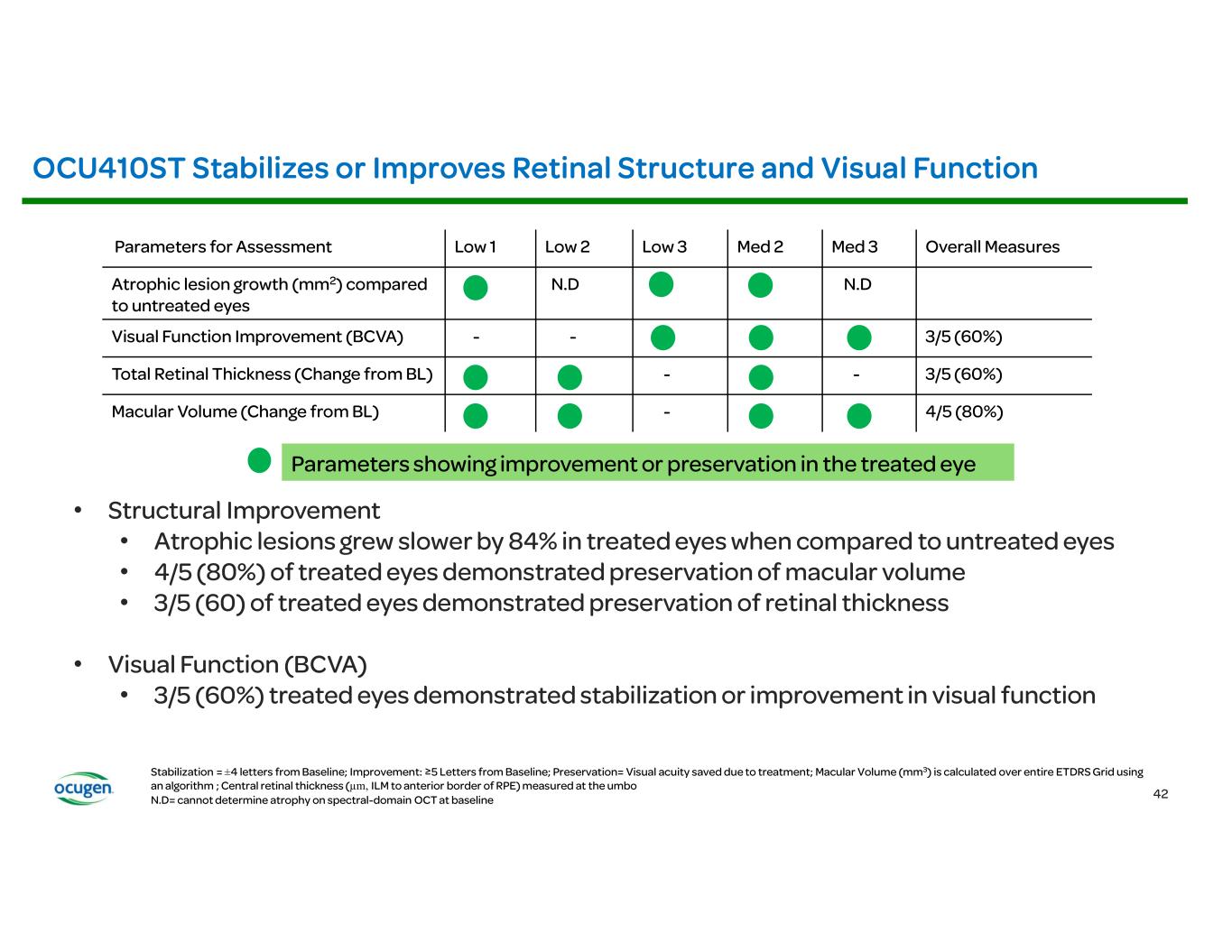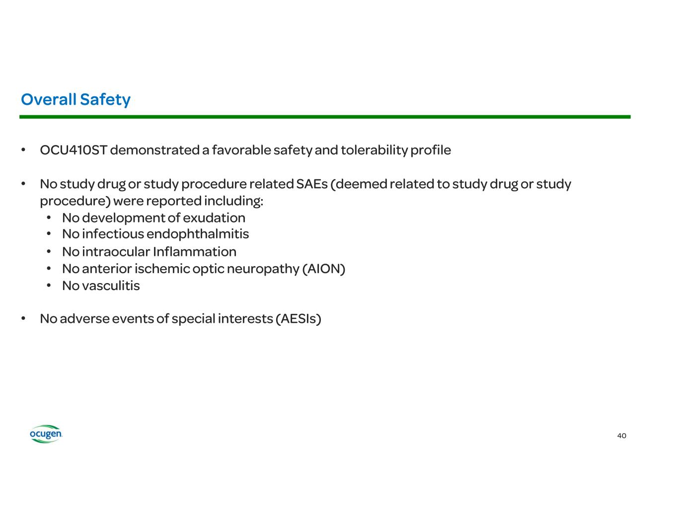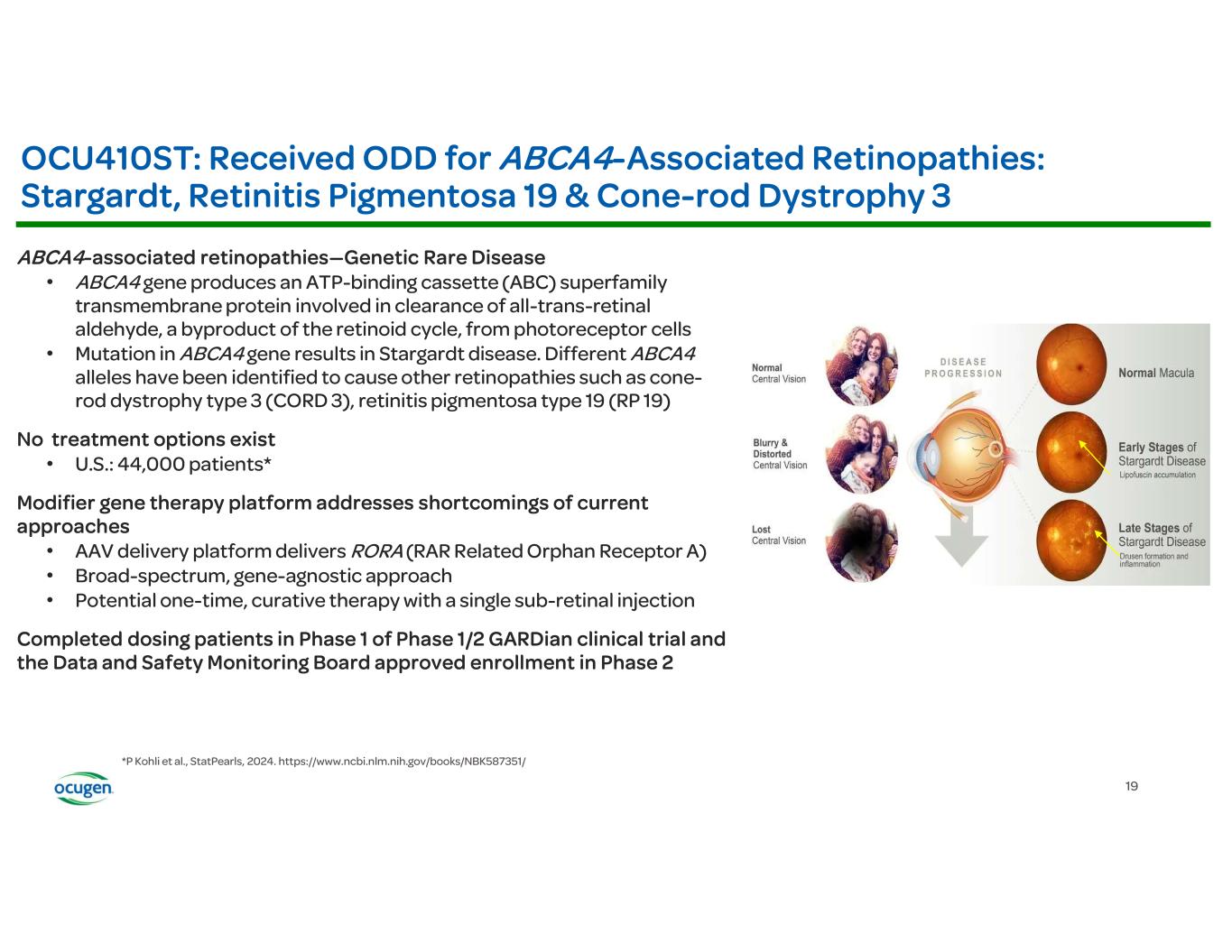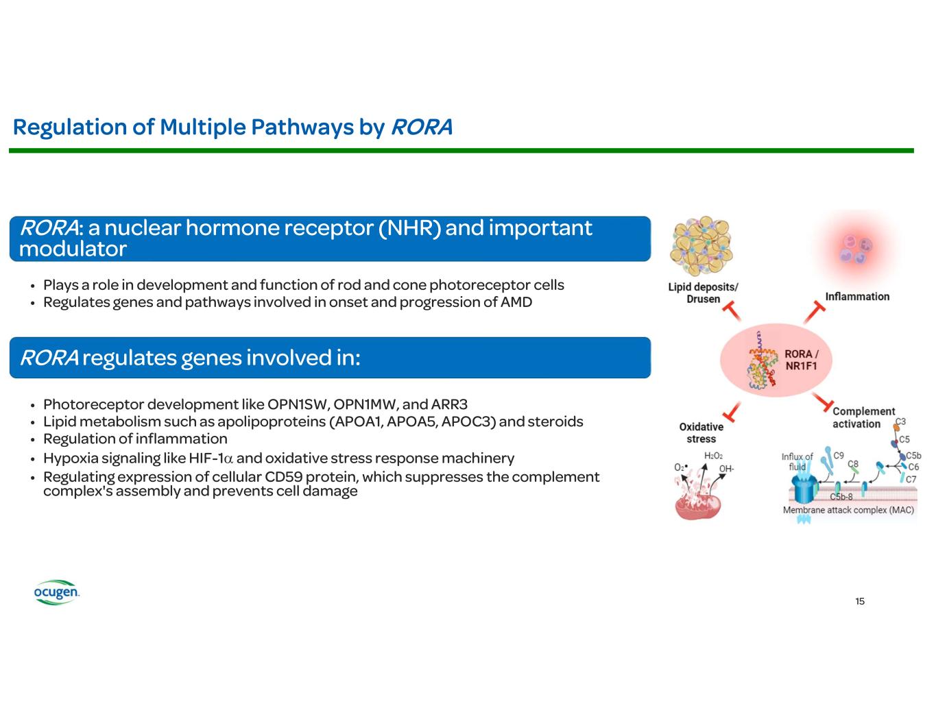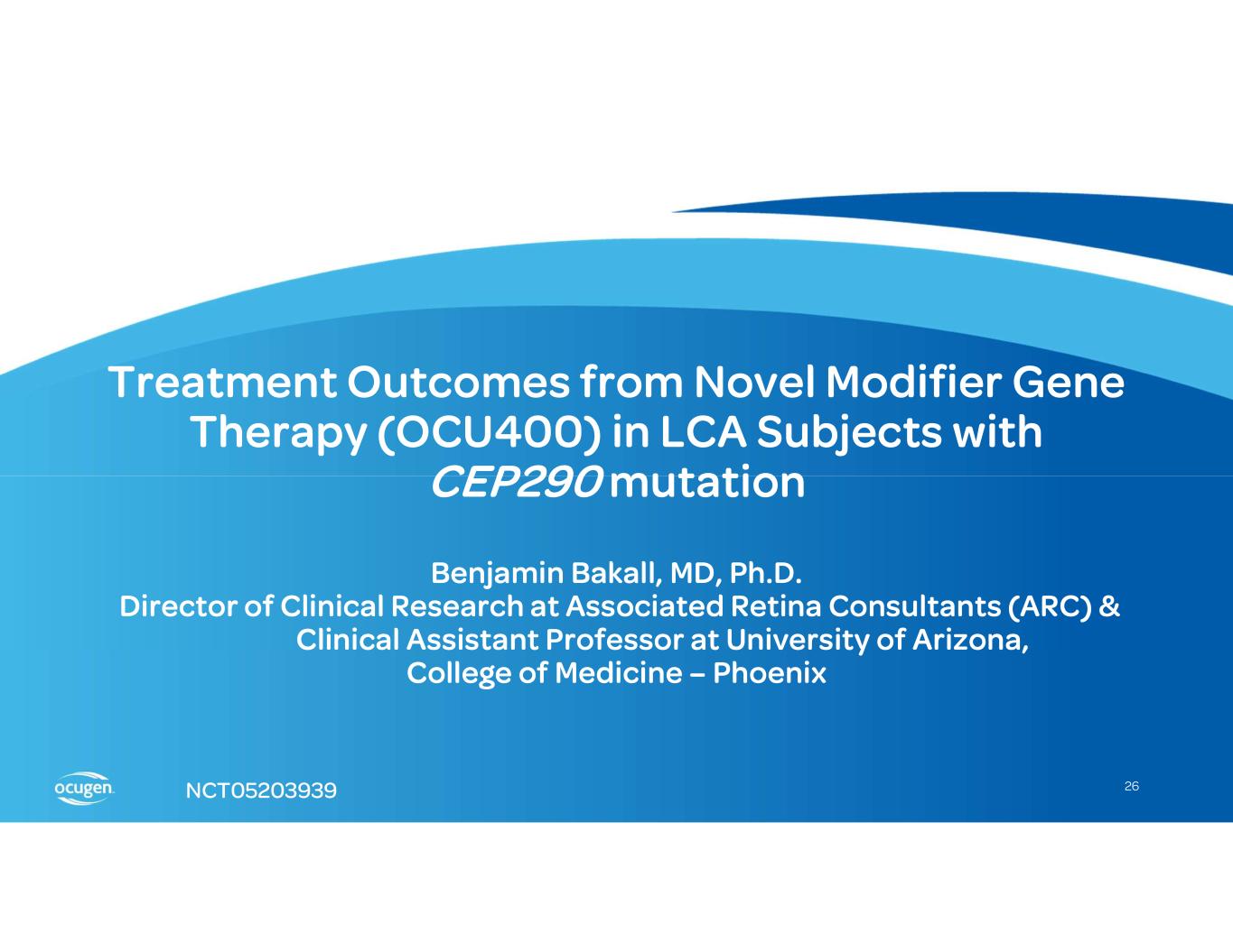 • • • • OCU400 (AAV encoding NR2E3) Rho-/- RhoP23H+/- Rd7 (NR2E3) Rd1 (PDE6B) Rd16 (CEP290) Adapted from: § Li et al., Nature Gene Therapy, 2021 § McNamee et al., Nature Gene Therapy, 2024 Fundus Imaging Improvement in Retinal Structure OCU400 Untreated Treated Histology Slow/Stop Retina Degeneration OCU400 Untreated Treated Biomarkers: Molecular reset Restoration of Expression of Key Transcription Factors Immunofluorescence (IF) Restoration of Phototransduction Gene Expression OCU400 Untreated Treated RP LCA Preclinical Animal Models: Electroretinography (ERG) Improvement in Photoreceptor Function