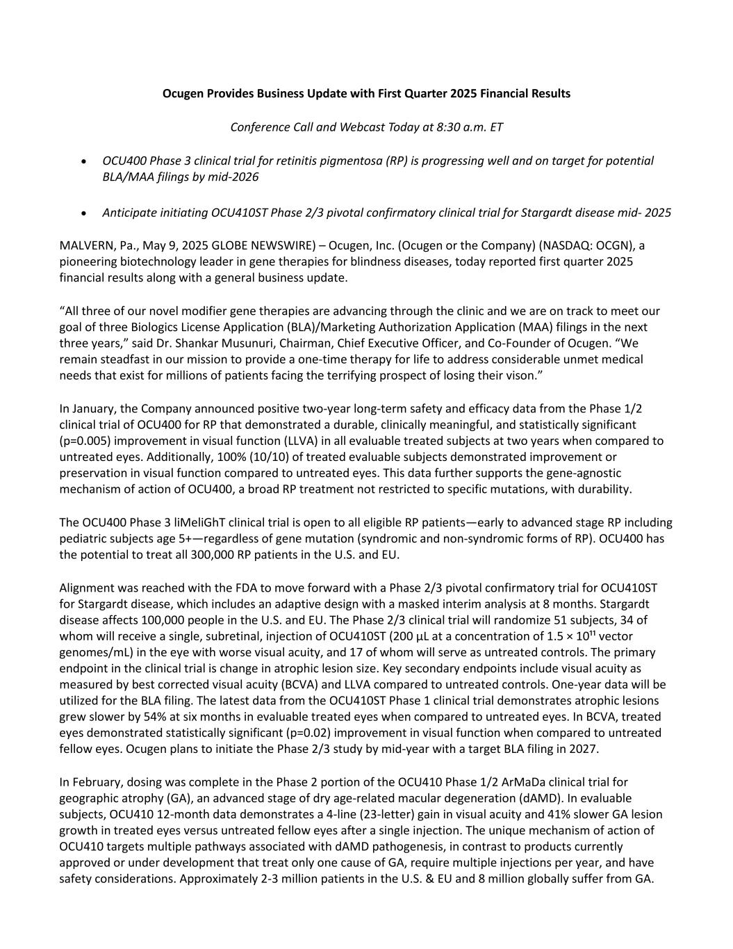 Ocugen Provides Business Update with First Quarter 2025 Financial Results Conference Call and Webcast Today at 8:30 a.m. ET • OCU400 Phase 3 clinical trial for retinitis pigmentosa (RP) is progressing well and on target for potential BLA/MAA filings by mid-2026 • Anticipate initiating OCU410ST Phase 2/3 pivotal confirmatory clinical trial for Stargardt disease mid- 2025 MALVERN, Pa., May 9, 2025 GLOBE NEWSWIRE) – Ocugen, Inc. (Ocugen or the Company) (NASDAQ: OCGN), a pioneering biotechnology leader in gene therapies for blindness diseases, today reported first quarter 2025 financial results along with a general business update. “All three of our novel modifier gene therapies are advancing through the clinic and we are on track to meet our goal of three Biologics License Application (BLA)/Marketing Authorization Application (MAA) filings in the next three years,” said Dr. Shankar Musunuri, Chairman, Chief Executive Officer, and Co-Founder of Ocugen. “We remain steadfast in our mission to provide a one-time therapy for life to address considerable unmet medical needs that exist for millions of patients facing the terrifying prospect of losing their vison.” In January, the Company announced positive two-year long-term safety and efficacy data from the Phase 1/2 clinical trial of OCU400 for RP that demonstrated a durable, clinically meaningful, and statistically significant (p=0.005) improvement in visual function (LLVA) in all evaluable treated subjects at two years when compared to untreated eyes. Additionally, 100% (10/10) of treated evaluable subjects demonstrated improvement or preservation in visual function compared to untreated eyes. This data further supports the gene-agnostic mechanism of action of OCU400, a broad RP treatment not restricted to specific mutations, with durability. The OCU400 Phase 3 liMeliGhT clinical trial is open to all eligible RP patients—early to advanced stage RP including pediatric subjects age 5+—regardless of gene mutation (syndromic and non-syndromic forms of RP). OCU400 has the potential to treat all 300,000 RP patients in the U.S. and EU. Alignment was reached with the FDA to move forward with a Phase 2/3 pivotal confirmatory trial for OCU410ST for Stargardt disease, which includes an adaptive design with a masked interim analysis at 8 months. Stargardt disease affects 100,000 people in the U.S. and EU. The Phase 2/3 clinical trial will randomize 51 subjects, 34 of whom will receive a single, subretinal, injection of OCU410ST (200 μL at a concentration of 1.5 × 10¹¹ vector genomes/mL) in the eye with worse visual acuity, and 17 of whom will serve as untreated controls. The primary endpoint in the clinical trial is change in atrophic lesion size. Key secondary endpoints include visual acuity as measured by best corrected visual acuity (BCVA) and LLVA compared to untreated controls. One-year data will be utilized for the BLA filing. The latest data from the OCU410ST Phase 1 clinical trial demonstrates atrophic lesions grew slower by 54% at six months in evaluable treated eyes when compared to untreated eyes. In BCVA, treated eyes demonstrated statistically significant (p=0.02) improvement in visual function when compared to untreated fellow eyes. Ocugen plans to initiate the Phase 2/3 study by mid-year with a target BLA filing in 2027. In February, dosing was complete in the Phase 2 portion of the OCU410 Phase 1/2 ArMaDa clinical trial for geographic atrophy (GA), an advanced stage of dry age-related macular degeneration (dAMD). In evaluable subjects, OCU410 12-month data demonstrates a 4-line (23-letter) gain in visual acuity and 41% slower GA lesion growth in treated eyes versus untreated fellow eyes after a single injection. The unique mechanism of action of OCU410 targets multiple pathways associated with dAMD pathogenesis, in contrast to products currently approved or under development that treat only one cause of GA, require multiple injections per year, and have safety considerations. Approximately 2-3 million patients in the U.S. & EU and 8 million globally suffer from GA.