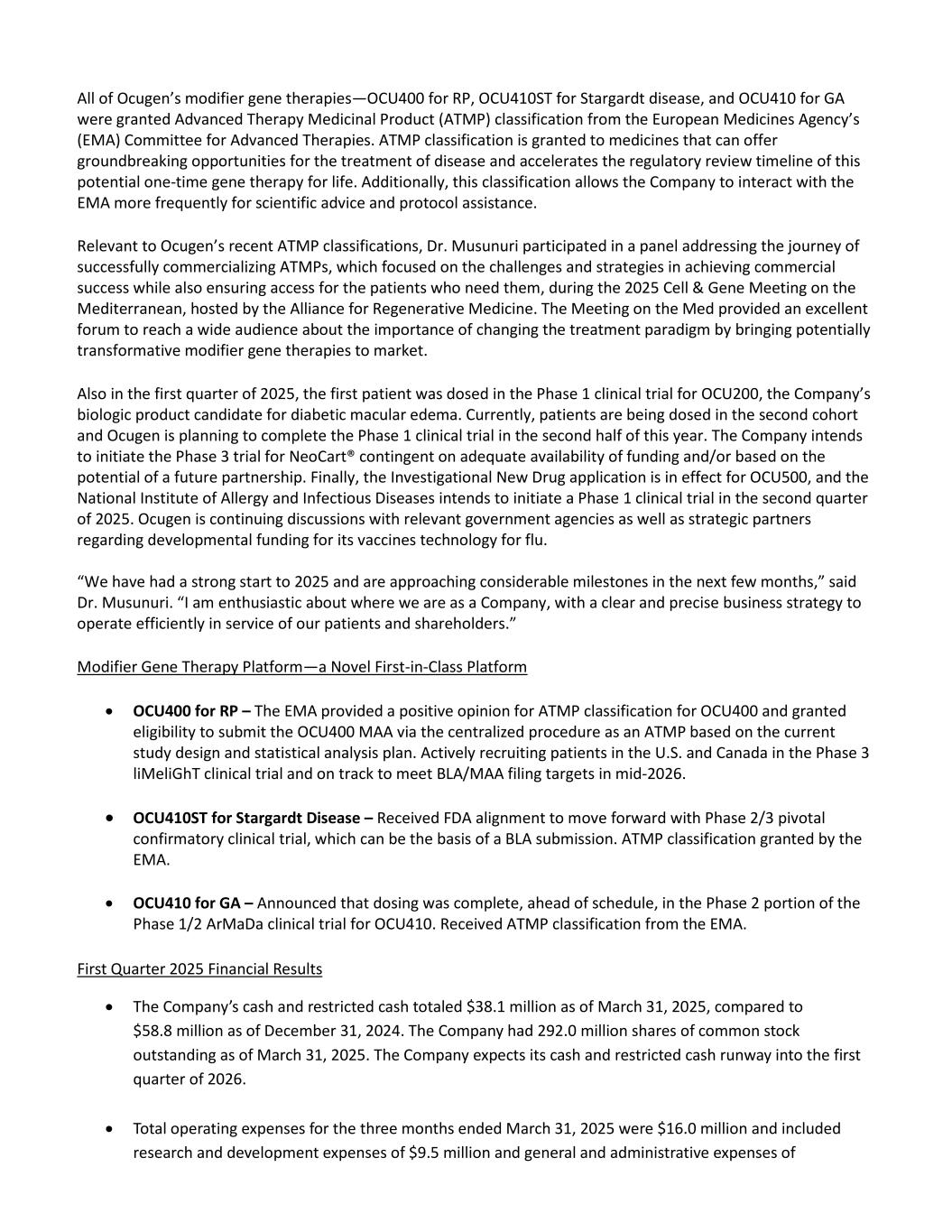 All of Ocugen’s modifier gene therapies—OCU400 for RP, OCU410ST for Stargardt disease, and OCU410 for GA were granted Advanced Therapy Medicinal Product (ATMP) classification from the European Medicines Agency’s (EMA) Committee for Advanced Therapies. ATMP classification is granted to medicines that can offer groundbreaking opportunities for the treatment of disease and accelerates the regulatory review timeline of this potential one-time gene therapy for life. Additionally, this classification allows the Company to interact with the EMA more frequently for scientific advice and protocol assistance. Relevant to Ocugen’s recent ATMP classifications, Dr. Musunuri participated in a panel addressing the journey of successfully commercializing ATMPs, which focused on the challenges and strategies in achieving commercial success while also ensuring access for the patients who need them, during the 2025 Cell & Gene Meeting on the Mediterranean, hosted by the Alliance for Regenerative Medicine. The Meeting on the Med provided an excellent forum to reach a wide audience about the importance of changing the treatment paradigm by bringing potentially transformative modifier gene therapies to market. Also in the first quarter of 2025, the first patient was dosed in the Phase 1 clinical trial for OCU200, the Company’s biologic product candidate for diabetic macular edema. Currently, patients are being dosed in the second cohort and Ocugen is planning to complete the Phase 1 clinical trial in the second half of this year. The Company intends to initiate the Phase 3 trial for NeoCart® contingent on adequate availability of funding and/or based on the potential of a future partnership. Finally, the Investigational New Drug application is in effect for OCU500, and the National Institute of Allergy and Infectious Diseases intends to initiate a Phase 1 clinical trial in the second quarter of 2025. Ocugen is continuing discussions with relevant government agencies as well as strategic partners regarding developmental funding for its vaccines technology for flu. “We have had a strong start to 2025 and are approaching considerable milestones in the next few months,” said Dr. Musunuri. “I am enthusiastic about where we are as a Company, with a clear and precise business strategy to operate efficiently in service of our patients and shareholders.” Modifier Gene Therapy Platform—a Novel First-in-Class Platform • OCU400 for RP – The EMA provided a positive opinion for ATMP classification for OCU400 and granted eligibility to submit the OCU400 MAA via the centralized procedure as an ATMP based on the current study design and statistical analysis plan. Actively recruiting patients in the U.S. and Canada in the Phase 3 liMeliGhT clinical trial and on track to meet BLA/MAA filing targets in mid-2026. • OCU410ST for Stargardt Disease – Received FDA alignment to move forward with Phase 2/3 pivotal confirmatory clinical trial, which can be the basis of a BLA submission. ATMP classification granted by the EMA. • OCU410 for GA – Announced that dosing was complete, ahead of schedule, in the Phase 2 portion of the Phase 1/2 ArMaDa clinical trial for OCU410. Received ATMP classification from the EMA. First Quarter 2025 Financial Results • The Company’s cash and restricted cash totaled $38.1 million as of March 31, 2025, compared to $58.8 million as of December 31, 2024. The Company had 292.0 million shares of common stock outstanding as of March 31, 2025. The Company expects its cash and restricted cash runway into the first quarter of 2026. • Total operating expenses for the three months ended March 31, 2025 were $16.0 million and included research and development expenses of $9.5 million and general and administrative expenses of