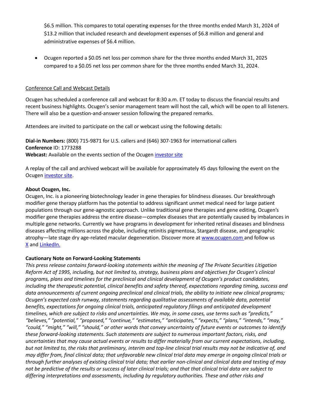 $6.5 million. This compares to total operating expenses for the three months ended March 31, 2024 of $13.2 million that included research and development expenses of $6.8 million and general and administrative expenses of $6.4 million. • Ocugen reported a $0.05 net loss per common share for the three months ended March 31, 2025 compared to a $0.05 net loss per common share for the three months ended March 31, 2024. Conference Call and Webcast Details Ocugen has scheduled a conference call and webcast for 8:30 a.m. ET today to discuss the financial results and recent business highlights. Ocugen’s senior management team will host the call, which will be open to all listeners. There will also be a question-and-answer session following the prepared remarks. Attendees are invited to participate on the call or webcast using the following details: Dial-in Numbers: (800) 715-9871 for U.S. callers and (646) 307-1963 for international callers Conference ID: 1773288 Webcast: Available on the events section of the Ocugen investor site A replay of the call and archived webcast will be available for approximately 45 days following the event on the Ocugen investor site. About Ocugen, Inc. Ocugen, Inc. is a pioneering biotechnology leader in gene therapies for blindness diseases. Our breakthrough modifier gene therapy platform has the potential to address significant unmet medical need for large patient populations through our gene-agnostic approach. Unlike traditional gene therapies and gene editing, Ocugen’s modifier gene therapies address the entire disease—complex diseases that are potentially caused by imbalances in multiple gene networks. Currently we have programs in development for inherited retinal diseases and blindness diseases affecting millions across the globe, including retinitis pigmentosa, Stargardt disease, and geographic atrophy—late stage dry age-related macular degeneration. Discover more at www.ocugen.com and follow us X and LinkedIn. Cautionary Note on Forward-Looking Statements This press release contains forward-looking statements within the meaning of The Private Securities Litigation Reform Act of 1995, including, but not limited to, strategy, business plans and objectives for Ocugen’s clinical programs, plans and timelines for the preclinical and clinical development of Ocugen’s product candidates, including the therapeutic potential, clinical benefits and safety thereof, expectations regarding timing, success and data announcements of current ongoing preclinical and clinical trials, the ability to initiate new clinical programs; Ocugen’s expected cash runway, statements regarding qualitative assessments of available data, potential benefits, expectations for ongoing clinical trials, anticipated regulatory filings and anticipated development timelines, which are subject to risks and uncertainties. We may, in some cases, use terms such as “predicts,” “believes,” “potential,” “proposed,” “continue,” “estimates,” “anticipates,” “expects,” “plans,” “intends,” “may,” “could,” “might,” “will,” “should,” or other words that convey uncertainty of future events or outcomes to identify these forward-looking statements. Such statements are subject to numerous important factors, risks, and uncertainties that may cause actual events or results to differ materially from our current expectations, including, but not limited to, the risks that preliminary, interim and top-line clinical trial results may not be indicative of, and may differ from, final clinical data; that unfavorable new clinical trial data may emerge in ongoing clinical trials or through further analyses of existing clinical trial data; that earlier non-clinical and clinical data and testing of may not be predictive of the results or success of later clinical trials; and that that clinical trial data are subject to differing interpretations and assessments, including by regulatory authorities. These and other risks and
