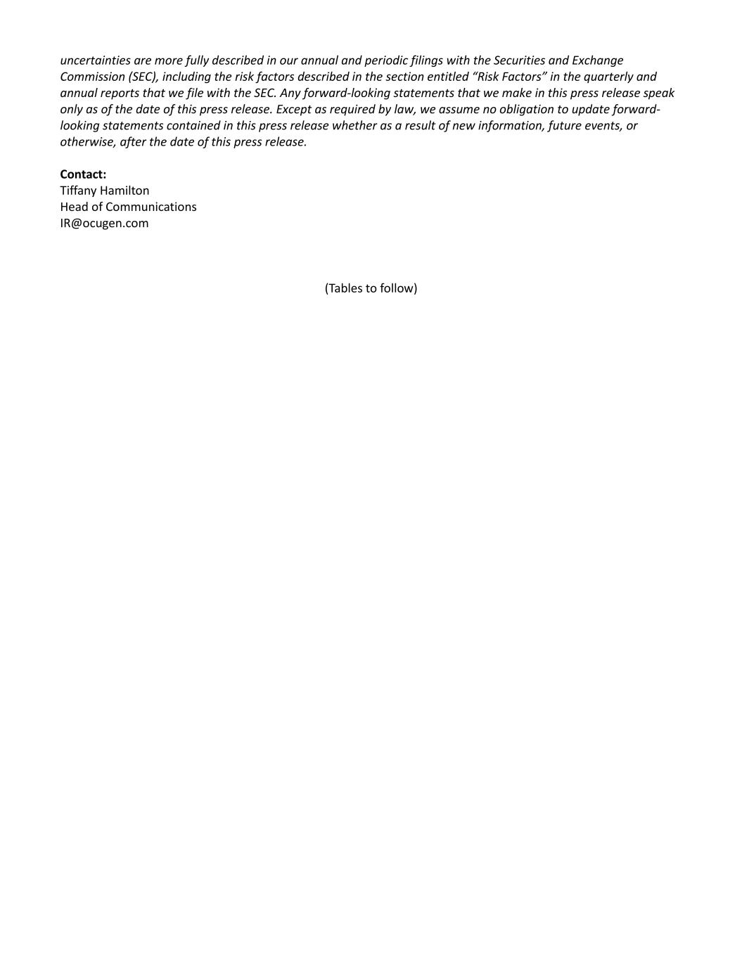uncertainties are more fully described in our annual and periodic filings with the Securities and Exchange Commission (SEC), including the risk factors described in the section entitled “Risk Factors” in the quarterly and annual reports that we file with the SEC. Any forward-looking statements that we make in this press release speak only as of the date of this press release. Except as required by law, we assume no obligation to update forward- looking statements contained in this press release whether as a result of new information, future events, or otherwise, after the date of this press release. Contact: Tiffany Hamilton Head of Communications IR@ocugen.com (Tables to follow)