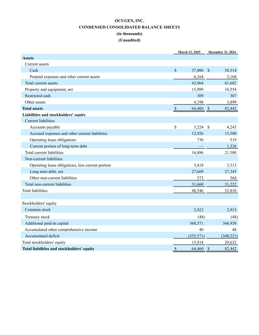 OCUGEN, INC. CONDENSED CONSOLIDATED BALANCE SHEETS (in thousands) (Unaudited) March 31, 2025 December 31, 2024 Assets Current assets Cash $ 37,800 $ 58,514 Prepaid expenses and other current assets 6,164 3,168 Total current assets 43,964 61,682 Property and equipment, net 15,989 16,554 Restricted cash 309 307 Other assets 4,198 3,899 Total assets $ 64,460 $ 82,442 Liabilities and stockholders' equity Current liabilities Accounts payable $ 3,224 $ 4,243 Accrued expenses and other current liabilities 12,926 15,500 Operating lease obligations 736 519 Current portion of long-term debt — 1,326 Total current liabilities 16,886 21,588 Non-current liabilities Operating lease obligations, less current portion 3,418 3,313 Long term debt, net 27,669 27,345 Other non-current liabilities 573 564 Total non-current liabilities 31,660 31,222 Total liabilities 48,546 52,810 Stockholders' equity Common stock 2,922 2,915 Treasury stock (48) (48) Additional paid-in capital 368,571 366,938 Accumulated other comprehensive income 40 48 Accumulated deficit (355,571) (340,221) Total stockholders' equity 15,914 29,632 Total liabilities and stockholders' equity $ 64,460 $ 82,442