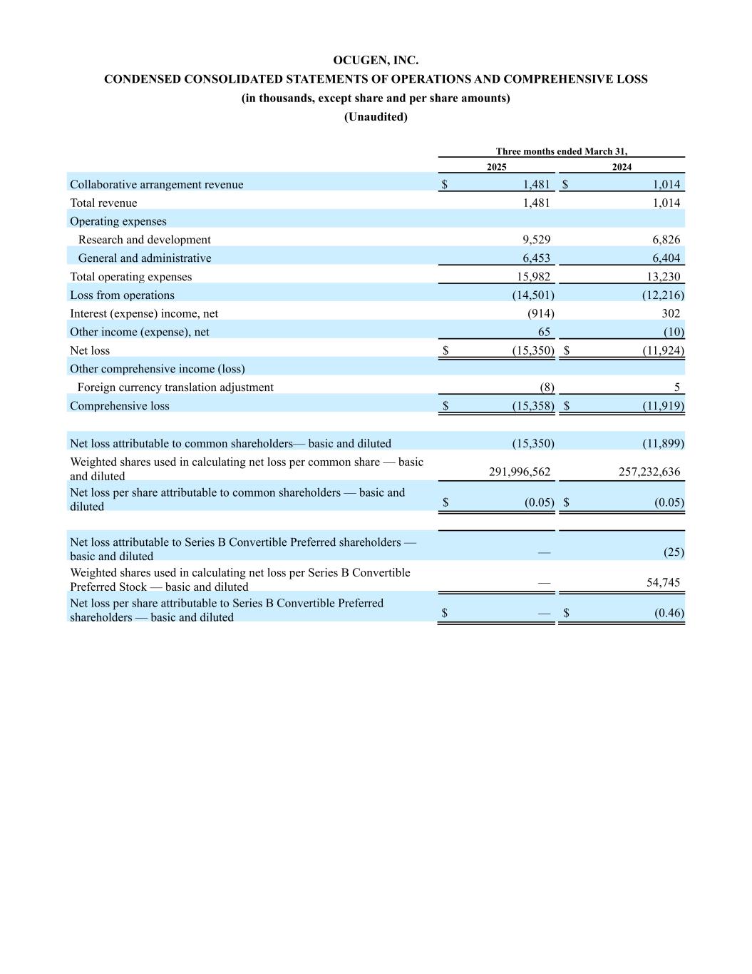OCUGEN, INC. CONDENSED CONSOLIDATED STATEMENTS OF OPERATIONS AND COMPREHENSIVE LOSS (in thousands, except share and per share amounts) (Unaudited) Three months ended March 31, 2025 2024 Collaborative arrangement revenue $ 1,481 $ 1,014 Total revenue 1,481 1,014 Operating expenses Research and development 9,529 6,826 General and administrative 6,453 6,404 Total operating expenses 15,982 13,230 Loss from operations (14,501) (12,216) Interest (expense) income, net (914) 302 Other income (expense), net 65 (10) Net loss $ (15,350) $ (11,924) Other comprehensive income (loss) Foreign currency translation adjustment (8) 5 Comprehensive loss $ (15,358) $ (11,919) Net loss attributable to common shareholders— basic and diluted (15,350) (11,899) Weighted shares used in calculating net loss per common share — basic and diluted 291,996,562 257,232,636 Net loss per share attributable to common shareholders — basic and diluted $ (0.05) $ (0.05) Net loss attributable to Series B Convertible Preferred shareholders — basic and diluted — (25) Weighted shares used in calculating net loss per Series B Convertible Preferred Stock — basic and diluted — 54,745 Net loss per share attributable to Series B Convertible Preferred shareholders — basic and diluted $ — $ (0.46)