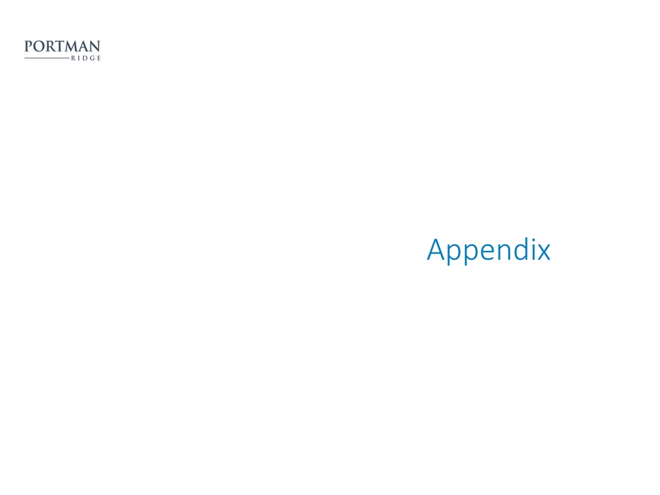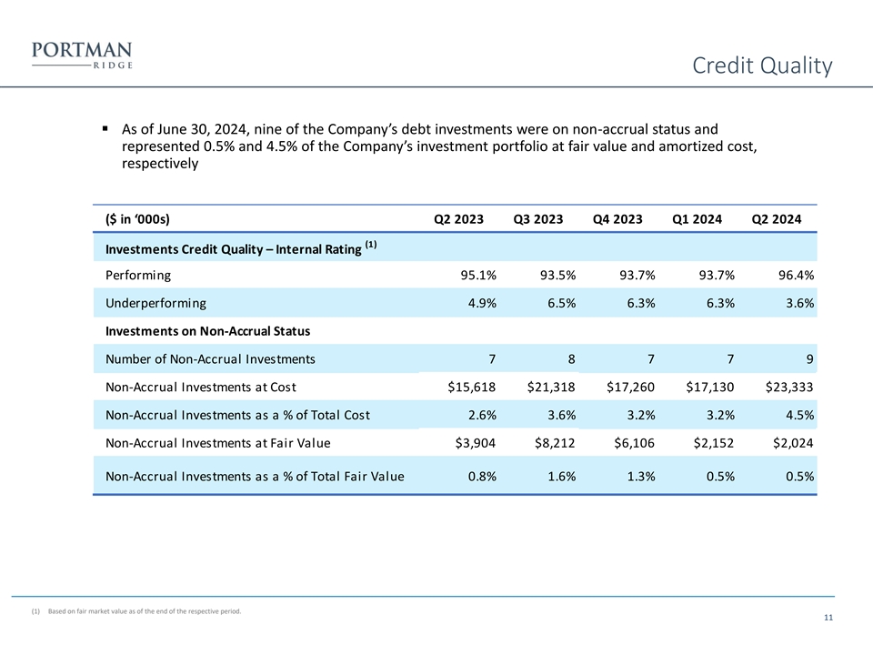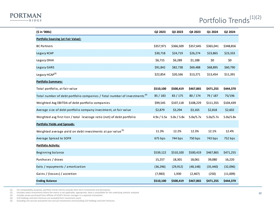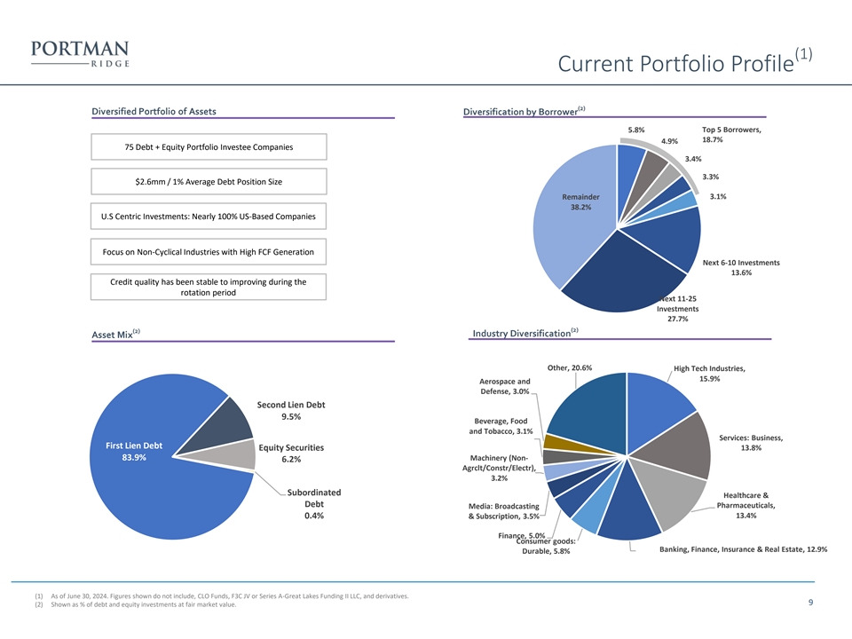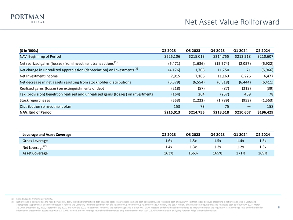 Net Asset Value Rollforward ($ in ‘000s) Q2 2023 Q3 2023 Q4 2023 Q1 2024 Q2 2024 NAV, Beginning of Period $225,106 $215,013 $214,755 $213,518 $210,607 (1) Net realized gains (losses) from investment transactions (6,471) (1,636) (15,574) (2,057) (6,922) (1) Net change in unrealized appreciation (depreciation) on investments (4,176) 1,708 11,750 71 (5,966) Net Investment Income 7,915 7,166 11,163 6,226 6,477 Net decrease in net assets resulting from stockholder distributions (6,579) (6,554) (6,518) (6,444) (6,411) Realized gains (losses) on extinguishments of debt (218) (57) (87) (213) (39) Tax (provision) benefit on realized and unrealized gains (losses) on investments (164) 264 (257) 459 78 Stock repurchases (553) (1,222) (1,789) (953) (1,553) Distribution reinvestment plan 153 73 75 — 158 NAV, End of Period $215,013 $214,755 $213,518 $210,607 $196,429 Leverage and Asset Coverage Q2 2023 Q3 2023 Q4 2023 Q1 2024 Q2 2024 Gross Leverage 1.6x 1.5x 1.5x 1.4x 1.5x (2) 1.4x 1.3x 1.2x 1.2x 1.3x Net Leverage Asset Coverage 163% 166% 165% 171% 169% (1) Excluding gains from merger activity. (2) Net leverage is calculated as the ratio between (A) debt, excluding unamortized debt issuance costs, less available cash and cash equivalents, and restricted cash and (B) NAV. Portman Ridge believes presenting a net leverage ratio is useful and appropriate supplemental disclosure because it reflects the Company’s financial condition net of $36.6 million, $39.6 million, $71.2 million $33.7 million, and $35.4 million, of cash and cash equivalents and restricted cash as of June 30, 2024, March 31, 2024, December 31, 2023, September 30, 2023, and June 30, 2023, respectively. However, the net leverage ratio is a non-U.S. GAAP measure and should not be considered as a replacement for the regulatory asset coverage ratio and other similar 8 information presented in accordance with U.S. GAAP. Instead, the net leverage ratio should be reviewed only in connection with such U.S. GAAP measures in analyzing Portman Ridge’s financial condition.