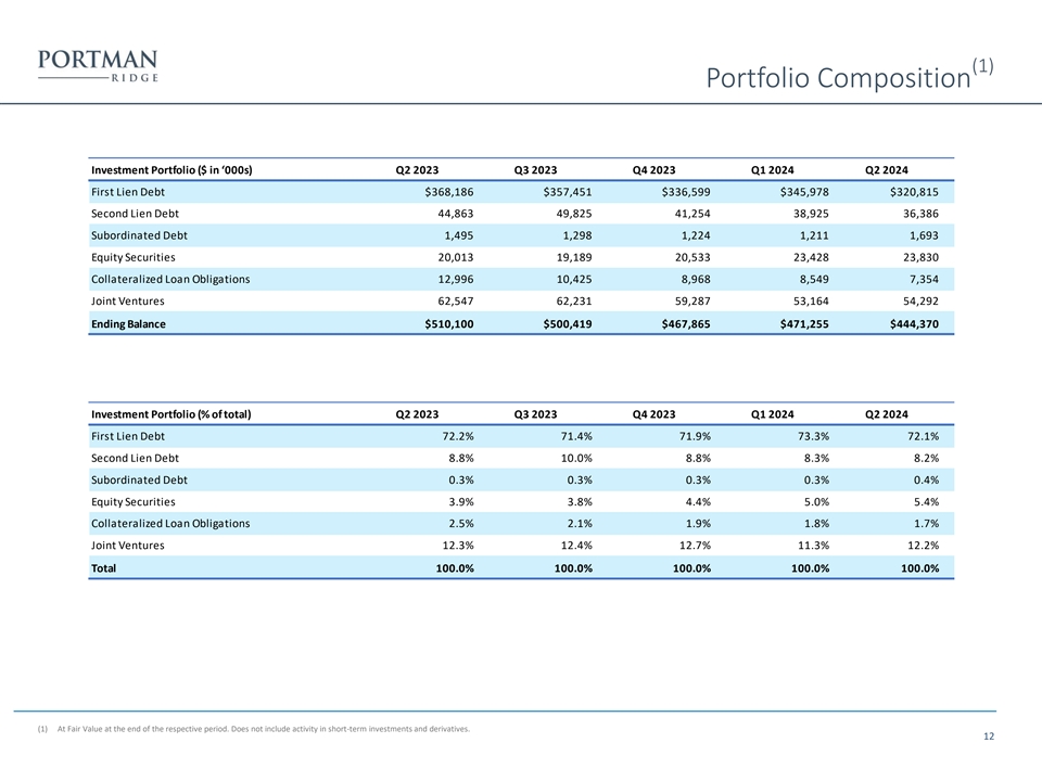 (1) Portfolio Composition Investment Portfolio ($ in ‘000s) Q2 2023 Q3 2023 Q4 2023 Q1 2024 Q2 2024 First Lien Debt $368,186 $357,451 $336,599 $345,978 $320,815 Second Lien Debt 44,863 49,825 41,254 38,925 36,386 Subordinated Debt 1,495 1,298 1,224 1,211 1,693 Equity Securities 20,013 19,189 20,533 23,428 23,830 Collateralized Loan Obligations 12,996 10,425 8,968 8,549 7,354 Joint Ventures 62,547 62,231 59,287 53,164 54,292 Ending Balance $510,100 $500,419 $467,865 $471,255 $444,370 Investment Portfolio (% of total) Q2 2023 Q3 2023 Q4 2023 Q1 2024 Q2 2024 First Lien Debt 72.2% 71.4% 71.9% 73.3% 72.1% Second Lien Debt 8.8% 10.0% 8.8% 8.3% 8.2% Subordinated Debt 0.3% 0.3% 0.3% 0.3% 0.4% Equity Securities 3.9% 3.8% 4.4% 5.0% 5.4% Collateralized Loan Obligations 2.5% 2.1% 1.9% 1.8% 1.7% Joint Ventures 12.3% 12.4% 12.7% 11.3% 12.2% Total 100.0% 100.0% 100.0% 100.0% 100.0% (1) At Fair Value at the end of the respective period. Does not include activity in short-term investments and derivatives. 12