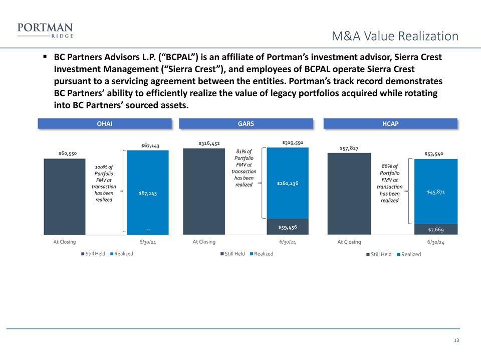 M&A Value Realization ▪ BC Partners Advisors L.P. (“BCPAL”) is an affiliate of Portman’s investment advisor, Sierra Crest Investment Management (“Sierra Crest”), and employees of BCPAL operate Sierra Crest pursuant to a servicing agreement between the entities. Portman’s track record demonstrates BC Partners’ ability to efficiently realize the value of legacy portfolios acquired while rotating into BC Partners’ sourced assets. OHAI GARS HCAP $319,591 $316,452 $67,143 $57,827 81% of $60,550 $53,540 Portfolio FMV at 86% of 100% of transaction Portfolio Portfolio has been FMV at FMV at $260,136 realized transaction transaction $45,871 $67,143 has been has been realized realized $59,456 – $7,669 At Closing 6/30/24 At Closing 6/30/24 At Closing 6/30/24 Still Held Realized Still Held Realized Still Held Realized 13