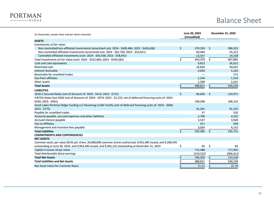 Balance Sheet June 30, 2024 December 31, 2023 (in thousands, except share and per share amounts) (Unaudited) ASSETS Investments at fair value: Non-controlled/non-affiliated investments (amortized cost: 2024 - $409,486; 2023 - $426,630) $ 370,359 $ 398,325 Non-controlled affiliated investments (amortized cost: 2024 - $62,769; 2023 - $55,611) 60,464 55,222 Controlled affiliated investments (cost: 2024 - $50,428; 2023 - $58,041) 13,547 14,318 Total Investments at Fair Value (cost: 2024 - $522,683; 2023 - $540,282) $ 444,370 $ 467,865 Cash and cash equivalents 9,813 26,912 Restricted cash 26,826 44,652 Interest receivable 4,659 5,162 Receivable for unsettled trades — 573 Due from affiliates 1,544 1,534 Other assets 1,599 2,541 Total Assets $ 488,811 $ 549,239 LIABILITIES 2018-2 Secured Notes (net of discount of: 2024 - $414; 2023 - $712) $ 84,656 $ 124,971 4.875% Notes Due 2026 (net of discount of: 2024 - $974; 2023 - $1,225; net of deferred financing costs of: 2024 - $430; 2023 - $561) 106,596 106,214 Great Lakes Portman Ridge Funding LLC Revolving Credit Facility (net of deferred financing costs of: 2024 - $609; 2023 - $775) 91,391 91,225 Payable for unsettled trades 37 520 Accounts payable, accrued expenses and other liabilities 2,700 4,252 Accrued interest payable 3,537 3,928 Due to affiliates 411 458 Management and incentive fees payable 3,054 4,153 Total Liabilities $ 292,382 $ 335,721 COMMITMENTS AND CONTINGENCIES NET ASSETS Common stock, par value $0.01 per share, 20,000,000 common shares authorized; 9,951,485 issued, and 9,260,495 outstanding at June 30, 2024, and 9,943,385 issued, and 9,383,132 outstanding at December 31, 2023 $ 93 $ 94 Capital in excess of par value 715,488 717,835 Total distributable (loss) earnings (519,152 ) (504,411 ) Total Net Assets $ 196,429 $ 213,518 Total Liabilities and Net Assets $ 488,811 $ 549,239 Net Asset Value Per Common Share $ 21.21 $ 22.76 15