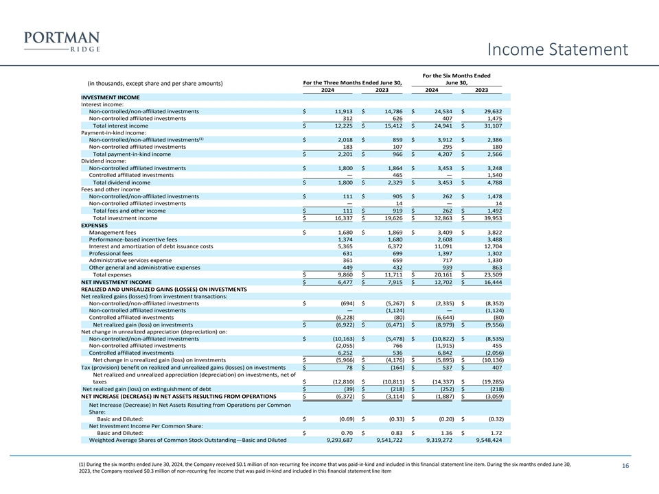 Income Statement For the Six Months Ended For the Three Months Ended June 30, June 30, (in thousands, except share and per share amounts) 2024 2023 2024 2023 INVESTMENT INCOME Interest income: Non-controlled/non-affiliated investments $ 11,913 $ 14,786 $ 24,534 $ 29,632 Non-controlled affiliated investments 312 626 407 1,475 Total interest income $ 12,225 $ 15,412 $ 24,941 $ 31,107 Payment-in-kind income: (1) Non-controlled/non-affiliated investments $ 2,018 $ 859 $ 3,912 $ 2,386 Non-controlled affiliated investments 183 107 295 180 Total payment-in-kind income $ 2,201 $ 966 $ 4,207 $ 2,566 Dividend income: Non-controlled affiliated investments $ 1,800 $ 1,864 $ 3,453 $ 3,248 Controlled affiliated investments — 465 — 1,540 Total dividend income $ 1,800 $ 2,329 $ 3,453 $ 4,788 Fees and other income Non-controlled/non-affiliated investments $ 111 $ 905 $ 262 $ 1,478 Non-controlled affiliated investments — 14 — 14 Total fees and other income $ 111 $ 919 $ 262 $ 1,492 Total investment income $ 16,337 $ 19,626 $ 32,863 $ 39,953 EXPENSES Management fees $ 1,680 $ 1,869 $ 3,409 $ 3,822 Performance-based incentive fees 1,374 1,680 2,608 3,488 Interest and amortization of debt issuance costs 5,365 6,372 11,091 12,704 Professional fees 631 699 1,397 1,302 Administrative services expense 361 659 717 1,330 Other general and administrative expenses 449 432 939 863 Total expenses $ 9,860 $ 11,711 $ 20,161 $ 23,509 NET INVESTMENT INCOME $ 6,477 $ 7,915 $ 12,702 $ 16,444 REALIZED AND UNREALIZED GAINS (LOSSES) ON INVESTMENTS Net realized gains (losses) from investment transactions: Non-controlled/non-affiliated investments $ (694 ) $ (5,267) $ (2,335) $ (8,352 ) Non-controlled affiliated investments — (1,124 ) — (1,124) Controlled affiliated investments (6,228) (80 ) (6,644) (80) Net realized gain (loss) on investments $ (6,922 ) $ (6,471) $ (8,979) $ (9,556 ) Net change in unrealized appreciation (depreciation) on: Non-controlled/non-affiliated investments $ (10,163 ) $ (5,478) $ (10,822) $ (8,535) Non-controlled affiliated investments (2,055) 766 (1,915 ) 455 Controlled affiliated investments 6,252 536 6,842 (2,056) Net change in unrealized gain (loss) on investments $ (5,966 ) $ (4,176 ) $ (5,895 ) $ (10,136) Tax (provision) benefit on realized and unrealized gains (losses) on investments $ 78 $ (164 ) $ 537 $ 407 Net realized and unrealized appreciation (depreciation) on investments, net of taxes $ (12,810 ) $ (10,811) $ (14,337) $ (19,285 ) Net realized gain (loss) on extinguishment of debt $ (39 ) $ (218 ) $ (252) $ (218 ) NET INCREASE (DECREASE) IN NET ASSETS RESULTING FROM OPERATIONS $ (6,372 ) $ (3,114 ) $ (1,887 ) $ (3,059) Net Increase (Decrease) In Net Assets Resulting from Operations per Common Share: Basic and Diluted: $ (0.69) $ (0.33) $ (0.20) $ (0.32) Net Investment Income Per Common Share: Basic and Diluted: $ 0.70 $ 0.83 $ 1.36 $ 1.72 Weighted Average Shares of Common Stock Outstanding—Basic and Diluted 9,293,687 9,541,722 9,319,272 9,548,424 (1) During the six months ended June 30, 2024, the Company received $0.1 million of non-recurring fee income that was paid-in-kind and included in this financial statement line item. During the six months ended June 30, 16 2023, the Company received $0.3 million of non-recurring fee income that was paid in-kind and included in this financial statement line item