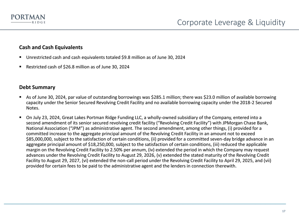 Corporate Leverage & Liquidity Cash and Cash Equivalents ▪ Unrestricted cash and cash equivalents totaled $9.8 million as of June 30, 2024 ▪ Restricted cash of $26.8 million as of June 30, 2024 Debt Summary ▪ As of June 30, 2024, par value of outstanding borrowings was $285.1 million; there was $23.0 million of available borrowing capacity under the Senior Secured Revolving Credit Facility and no available borrowing capacity under the 2018-2 Secured Notes. ▪ On July 23, 2024, Great Lakes Portman Ridge Funding LLC, a wholly-owned subsidiary of the Company, entered into a second amendment of its senior secured revolving credit facility (“Revolving Credit Facility”) with JPMorgan Chase Bank, National Association (“JPM”) as administrative agent. The second amendment, among other things, (i) provided for a committed increase to the aggregate principal amount of the Revolving Credit Facility in an amount not to exceed $85,000,000, subject to the satisfaction of certain conditions, (ii) provided for a committed seven-day bridge advance in an aggregate principal amount of $18,250,000, subject to the satisfaction of certain conditions, (iii) reduced the applicable margin on the Revolving Credit Facility to 2.50% per annum, (iv) extended the period in which the Company may request advances under the Revolving Credit Facility to August 29, 2026, (v) extended the stated maturity of the Revolving Credit Facility to August 29, 2027, (vi) extended the non-call period under the Revolving Credit Facility to April 29, 2025, and (vii) provided for certain fees to be paid to the administrative agent and the lenders in connection therewith. 17