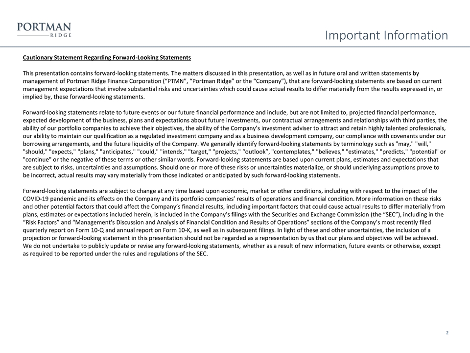 Important Information Cautionary Statement Regarding Forward-Looking Statements This presentation contains forward-looking statements. The matters discussed in this presentation, as well as in future oral and written statements by management of Portman Ridge Finance Corporation (“PTMN”, “Portman Ridge” or the “Company”), that are forward-looking statements are based on current management expectations that involve substantial risks and uncertainties which could cause actual results to differ materially from the results expressed in, or implied by, these forward-looking statements. Forward-looking statements relate to future events or our future financial performance and include, but are not limited to, projected financial performance, expected development of the business, plans and expectations about future investments, our contractual arrangements and relationships with third parties, the ability of our portfolio companies to achieve their objectives, the ability of the Company’s investment adviser to attract and retain highly talented professionals, our ability to maintain our qualification as a regulated investment company and as a business development company, our compliance with covenants under our borrowing arrangements, and the future liquidity of the Company. We generally identify forward-looking statements by terminology such as may, will, should, expects, plans, anticipates, could, intends, target, projects, “outlook”, contemplates, believes, estimates, predicts, potential or continue or the negative of these terms or other similar words. Forward-looking statements are based upon current plans, estimates and expectations that are subject to risks, uncertainties and assumptions. Should one or more of these risks or uncertainties materialize, or should underlying assumptions prove to be incorrect, actual results may vary materially from those indicated or anticipated by such forward-looking statements. Forward-looking statements are subject to change at any time based upon economic, market or other conditions, including with respect to the impact of the COVID-19 pandemic and its effects on the Company and its portfolio companies’ results of operations and financial condition. More information on these risks and other potential factors that could affect the Company’s financial results, including important factors that could cause actual results to differ materially from plans, estimates or expectations included herein, is included in the Company’s filings with the Securities and Exchange Commission (the “SEC”), including in the “Risk Factors” and “Management's Discussion and Analysis of Financial Condition and Results of Operations” sections of the Company’s most recently filed quarterly report on Form 10-Q and annual report on Form 10-K, as well as in subsequent filings. In light of these and other uncertainties, the inclusion of a projection or forward-looking statement in this presentation should not be regarded as a representation by us that our plans and objectives will be achieved. We do not undertake to publicly update or revise any forward-looking statements, whether as a result of new information, future events or otherwise, except as required to be reported under the rules and regulations of the SEC. 2