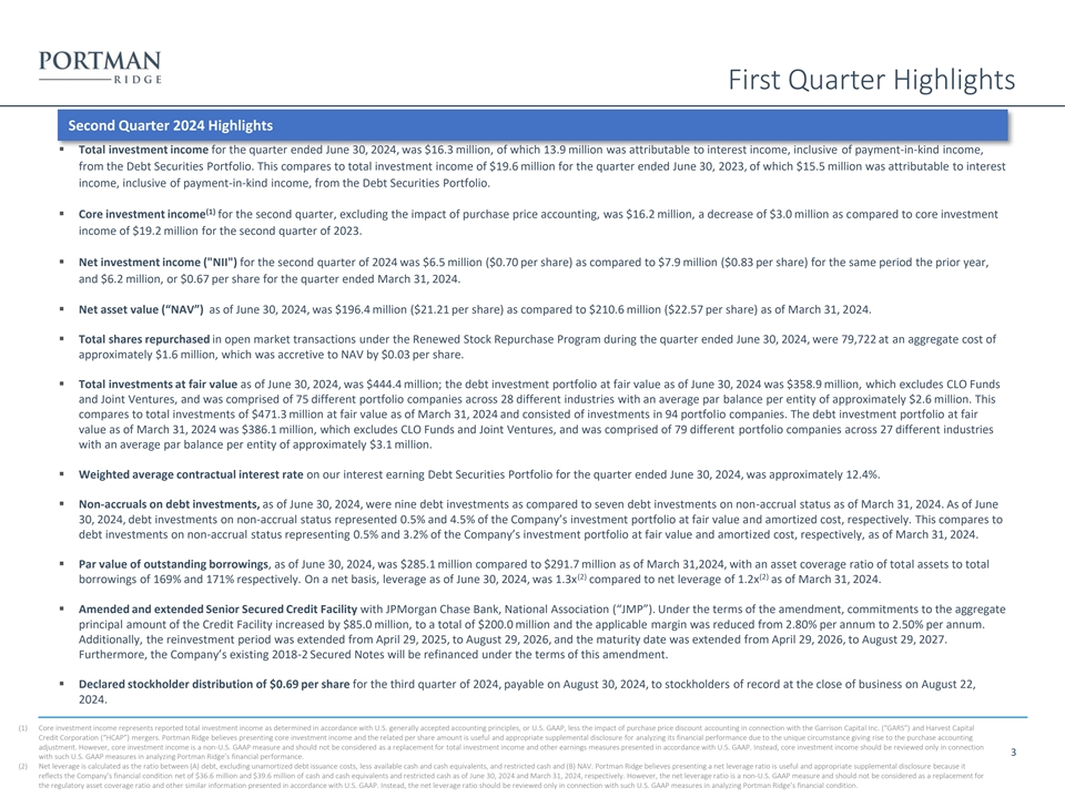 First Quarter Highlights Second Quarter 2024 Highlights ▪ Total investment income for the quarter ended June 30, 2024, was $16.3 million, of which 13.9 million was attributable to interest income, inclusive of payment-in-kind income, from the Debt Securities Portfolio. This compares to total investment income of $19.6 million for the quarter ended June 30, 2023, of which $15.5 million was attributable to interest income, inclusive of payment-in-kind income, from the Debt Securities Portfolio. (1) ▪ Core investment income for the second quarter, excluding the impact of purchase price accounting, was $16.2 million, a decrease of $3.0 million as compared to core investment income of $19.2 million for the second quarter of 2023. ▪ Net investment income ( NII ) for the second quarter of 2024 was $6.5 million ($0.70 per share) as compared to $7.9 million ($0.83 per share) for the same period the prior year, and $6.2 million, or $0.67 per share for the quarter ended March 31, 2024. ▪ Net asset value (“NAV”) as of June 30, 2024, was $196.4 million ($21.21 per share) as compared to $210.6 million ($22.57 per share) as of March 31, 2024. ▪ Total shares repurchased in open market transactions under the Renewed Stock Repurchase Program during the quarter ended June 30, 2024, were 79,722 at an aggregate cost of approximately $1.6 million, which was accretive to NAV by $0.03 per share. ▪ Total investments at fair value as of June 30, 2024, was $444.4 million; the debt investment portfolio at fair value as of June 30, 2024 was $358.9 million, which excludes CLO Funds and Joint Ventures, and was comprised of 75 different portfolio companies across 28 different industries with an average par balance per entity of approximately $2.6 million. This compares to total investments of $471.3 million at fair value as of March 31, 2024 and consisted of investments in 94 portfolio companies. The debt investment portfolio at fair value as of March 31, 2024 was $386.1 million, which excludes CLO Funds and Joint Ventures, and was comprised of 79 different portfolio companies across 27 different industries with an average par balance per entity of approximately $3.1 million. ▪ Weighted average contractual interest rate on our interest earning Debt Securities Portfolio for the quarter ended June 30, 2024, was approximately 12.4%. ▪ Non-accruals on debt investments, as of June 30, 2024, were nine debt investments as compared to seven debt investments on non-accrual status as of March 31, 2024. As of June 30, 2024, debt investments on non-accrual status represented 0.5% and 4.5% of the Company’s investment portfolio at fair value and amortized cost, respectively. This compares to debt investments on non-accrual status representing 0.5% and 3.2% of the Company’s investment portfolio at fair value and amortized cost, respectively, as of March 31, 2024. ▪ Par value of outstanding borrowings, as of June 30, 2024, was $285.1 million compared to $291.7 million as of March 31,2024, with an asset coverage ratio of total assets to total (2) (2) borrowings of 169% and 171% respectively. On a net basis, leverage as of June 30, 2024, was 1.3x compared to net leverage of 1.2x as of March 31, 2024. ▪ Amended and extended Senior Secured Credit Facility with JPMorgan Chase Bank, National Association (“JMP”). Under the terms of the amendment, commitments to the aggregate principal amount of the Credit Facility increased by $85.0 million, to a total of $200.0 million and the applicable margin was reduced from 2.80% per annum to 2.50% per annum. Additionally, the reinvestment period was extended from April 29, 2025, to August 29, 2026, and the maturity date was extended from April 29, 2026, to August 29, 2027. Furthermore, the Company’s existing 2018-2 Secured Notes will be refinanced under the terms of this amendment. ▪ Declared stockholder distribution of $0.69 per share for the third quarter of 2024, payable on August 30, 2024, to stockholders of record at the close of business on August 22, 2024. (1) Core investment income represents reported total investment income as determined in accordance with U.S. generally accepted accounting principles, or U.S. GAAP, less the impact of purchase price discount accounting in connection with the Garrison Capital Inc. (“GARS”) and Harvest Capital Credit Corporation (“HCAP”) mergers. Portman Ridge believes presenting core investment income and the related per share amount is useful and appropriate supplemental disclosure for analyzing its financial performance due to the unique circumstance giving rise to the purchase accounting adjustment. However, core investment income is a non-U.S. GAAP measure and should not be considered as a replacement for total investment income and other earnings measures presented in accordance with U.S. GAAP. Instead, core investment income should be reviewed only in connection 3 with such U.S. GAAP measures in analyzing Portman Ridge’s financial performance. (2) Net leverage is calculated as the ratio between (A) debt, excluding unamortized debt issuance costs, less available cash and cash equivalents, and restricted cash and (B) NAV. Portman Ridge believes presenting a net leverage ratio is useful and appropriate supplemental disclosure because it reflects the Company’s financial condition net of $36.6 million and $39.6 million of cash and cash equivalents and restricted cash as of June 30, 2024 and March 31, 2024, respectively. However, the net leverage ratio is a non-U.S. GAAP measure and should not be considered as a replacement for the regulatory asset coverage ratio and other similar information presented in accordance with U.S. GAAP. Instead, the net leverage ratio should be reviewed only in connection with such U.S. GAAP measures in analyzing Portman Ridge’s financial condition.