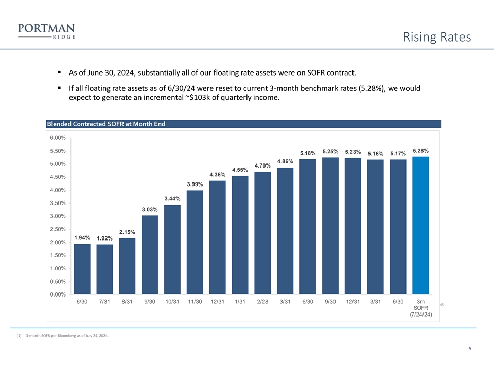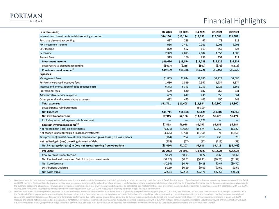 Financial Highlights ($ in thousands) Q2 2023 Q3 2023 Q4 2023 Q1 2024 Q2 2024 Interest from investments in debt excluding accretion $14,156 $13,174 $13,196 $12,088 $11,589 Purchase discount accounting 427 238 67 73 112 PIK Investment Income 966 2,421 2,081 2,006 2,201 CLO Income 829 502 119 555 524 JV Income 2,329 2,073 2,087 1,653 1,800 Service Fees 919 166 238 151 111 Investment Income $19,626 $18,574 $17,788 $16,526 $16,337 Less: Purchase discount accounting ($427) ($238) ($67) ($73) ($112) (1) $19,199 $18,336 $17,721 $16,453 $16,225 Core investment income Expenses: Management fees $1,869 $1,844 $1,786 $1,729 $1,680 Performance-based incentive fees 1,680 1,519 2,367 1,234 1,374 Interest and amortization of debt issuance costs 6,372 6,343 6,259 5,725 5,365 Professional fees 699 640 687 766 631 Administrative services expense 659 617 430 356 361 Other general and administrative expenses 432 445 405 490 449 Total expenses $11,711 $11,408 $11,934 $10,300 $9,860 Less: Expense reimbursement - - (5,309) - - Net Expenses $11,711 $11,408 $6,625 $10,300 $9,860 Net investment income $7,915 $7,166 $11,163 $6,226 $6,477 Excluding impact of expense reimbursement — — 4,371 — — (2) $7,563 $6,928 $6,792 $6,153 $6,384 Core net investment income Net realized gain (loss) on investments (6,471) (1,636) (15,574) (2,057) (6,922) Net change in unrealized gain (loss) on investments ( 4,176) 1 ,708 1 1,750 71 (5,966) Tax (provision) benefit on realized and unrealized gains (losses) on investments (164) 264 (257) 459 78 Net realized gain (loss) on extinguishment of debt (218) (57) ( 87) ( 213) (39) Net increase/(decrease) in Core net assets resulting from operations ($3,466) $7,207 $2,611 $4,413 ($6,465) Per Share Q2 2023 Q3 2023 Q4 2023 Q1 2024 Q2 2024 Core Net Investment Income $0.79 $0.73 $0.72 $0.66 $0.69 Net Realized and Unrealized Gain / (Loss) on Investments ($1.12) $0.01 ($0.41) ($0.21) ($1.39) Net Core Earnings ($0.36) $0.76 $0.28 $0.47 ($0.70) Distributions Declared $0.69 $0.69 $0.69 $0.69 $0.69 Net Asset Value $22.54 $22.65 $22.76 $22.57 $21.21 (1) Core investment income represents reported total investment income as determined in accordance with U.S. generally accepted accounting principles, or U.S. GAAP, less the impact of purchase price discount accounting in connection with the GARS and HCAP mergers. Portman Ridge believes presenting core investment income and the related per share amount is useful and appropriate supplemental disclosure for analyzing its financial performance due to the unique circumstance giving rise to the purchase accounting adjustment. However, core investment income is a non-U.S. GAAP measure and should not be considered as a replacement for total investment income and other earnings measures presented in accordance with U.S. GAAP. Instead, core investment income should be reviewed only in connection with such U.S. GAAP measures in analyzing Portman Ridge’s financial performance. (2) Core net investment income represents reported total net investment income as determined in accordance with U.S. generally accepted accounting principles, or U.S. GAAP, less the impact of purchase price discount accounting in connection with the GARS and HCAP mergers, while also considering the impact of accretion from these mergers on expenses, such as incentive fees. Portman Ridge believes presenting core net investment income and the related per share amount is useful and appropriate supplemental disclosure for analyzing its financial performance due to the unique circumstance giving rise to the purchase accounting adjustment and the reimbursement. However, core net investment income is a non-U.S. GAAP 4 measure and should not be considered as a replacement for total net investment income and other earnings measures presented in accordance with U.S. GAAP. Instead, core net investment income should be reviewed only in connection with such U.S. GAAP measures in analyzing Portman Ridge’s financial performance. See slide 7 for a presentation of Reported net investment income in comparison to Core net investment income and a reconciliation thereof.