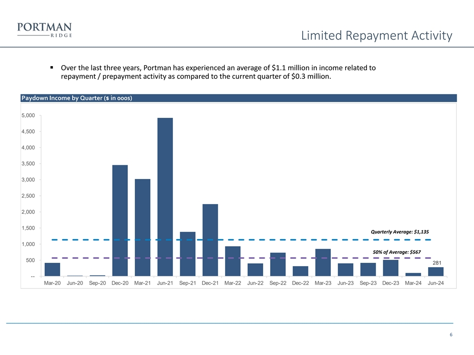 Limited Repayment Activity ▪ Over the last three years, Portman has experienced an average of $1.1 million in income related to repayment / prepayment activity as compared to the current quarter of $0.3 million. Paydown Income by Quarter ($ in 000s) 5,000 4,500 4,000 3,500 3,000 2,500 2,000 1,500 Quarterly Average: $1,135 1,000 50% of Average: $567 500 281 -- Mar-20 Jun-20 Sep-20 Dec-20 Mar-21 Jun-21 Sep-21 Dec-21 Mar-22 Jun-22 Sep-22 Dec-22 Mar-23 Jun-23 Sep-23 Dec-23 Mar-24 Jun-24 6