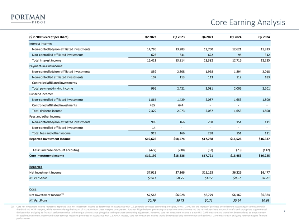 Core Earning Analysis ($ in ‘000s except per share) Q2 2023 Q3 2023 Q4 2023 Q1 2024 Q2 2024 Interest Income: Non-controlled/non-affiliated investments 14,786 13,283 12,760 12,621 11,913 Non-controlled affiliated investments 626 631 622 95 312 Total interest income 15,412 13,914 13,382 12,716 12,225 Payment-in-kind income: Non-controlled/non-affiliated investments 859 2,308 1,968 1,894 2,018 Non-controlled affiliated investments 107 113 113 112 183 Controlled affiliated investments - - - - - Total payment-in-kind income 966 2,421 2,081 2,006 2,201 Dividend income: Non-controlled affiliated investments 1,864 1,429 2,087 1,653 1,800 Controlled affiliated investments 465 644 - - - Total dividend income 2,329 2,073 2,087 1,653 1,800 Fees and other income: Non-controlled/non-affiliated investments 905 166 238 151 111 Non-controlled affiliated investments 14 - - - - Total fees and other income 919 166 238 151 111 Reported Investment Income $19,626 $18,574 $17,788 $16,526 $16,337 Less: Purchase discount accouting (427) (238) (67) (73) (112) Core Investment Income $19,199 $18,336 $17,721 $16,453 $16,225 Reported Net Investment Income $7,915 $7,166 $11,163 $6,226 $6,477 NII Per Share $0.83 $0.75 $1.17 $0.67 $0.70 Core (1) Net Investment Income $7,563 $6,928 $6,779 $6,162 $6,384 NII Per Share $0.79 $0.73 $0.71 $0.64 $0.69 (1) Core net investment income represents reported total net investment income as determined in accordance with U.S. generally accepted accounting principles, or U.S. GAAP, less the impact of purchase price discount accounting in connection with the GARS and HCAP mergers, while also considering the impact of accretion from these mergers on expenses. Portman Ridge believes presenting core net investment income and the related per share amount is useful and appropriate supplemental 7 disclosure for analyzing its financial performance due to the unique circumstance giving rise to the purchase accounting adjustment. However, core net investment income is a non-U.S. GAAP measure and should not be considered as a replacement for total net investment income and other earnings measures presented in accordance with U.S. GAAP. Instead, core net investment income should be reviewed only in connection with such U.S. GAAP measures in analyzing Portman Ridge’s financial performance.