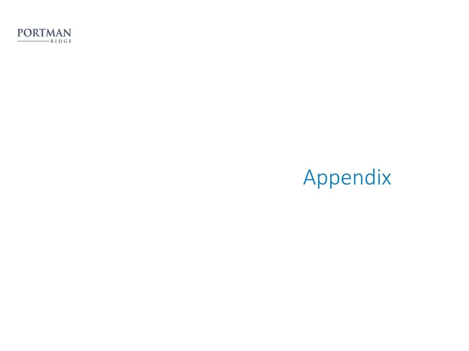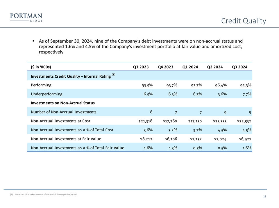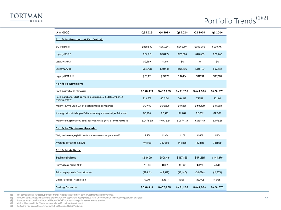 Net Asset Value Rollforward ($ in ‘000s) Q3 2023 Q4 2023 Q1 2024 Q2 2024 Q3 2024 NAV, Beginning of Period $215,013 $214,755 $213,518 $210,607 $196,429 (1) Net realized gains (losses) from investment transactions (1,636) (15,574) (2,057) (6,922) (11,419) (1) Net change in unrealized appreciation (depreciation) on investments 1,708 11,750 71 (5,966) 4,511 Net Investment Income 7,166 11,163 6,226 6,477 5,802 Net decrease in net assets resulting from stockholder distributions (6,554) (6,518) (6,444) (6,411) (6,382) Realized gains (losses) on extinguishments of debt (57) (87) (213) (39) (403) Tax (provision) benefit on realized and unrealized gains (losses) on investments 264 (257) 459 78 - Stock repurchases (1,222) (1,789) (953) (1,553) (638) Distribution reinvestment plan 73 75 — 158 82 NAV, End of Period $214,755 $213,518 $210,607 $196,429 $187,982 Leverage and Asset Coverage Q3 2023 Q4 2023 Q1 2024 Q2 2024 Q3 2024 Gross Leverage 1.5x 1.5x 1.4x 1.5x 1.4x (2) Net Leverage 1.3x 1.2x 1.2x 1.3x 1.3x Asset Coverage 166% 165% 171% 169% 170% (1) Excluding gains from merger activity. (2) Net leverage is calculated as the ratio between (A) debt, excluding unamortized debt issuance costs, less available cash and cash equivalents, and restricted cash and (B) NAV. Portman Ridge believes presenting a net leverage ratio is useful and appropriate supplemental disclosure because it reflects the Company’s financial condition net of $26.8 million, $36.6 million, $39.6 million, $71.2 million, and $33.7 million, of cash and cash equivalents and restricted cash as of September 30, 2024, June 30, 2024, March 31, 2024, December 31, 2023, and September 30, 2023, respectively. However, the net leverage ratio is a non-U.S. GAAP measure and should not be considered as a replacement for the regulatory asset coverage ratio and other 8 similar information presented in accordance with U.S. GAAP. Instead, the net leverage ratio should be reviewed only in connection with such U.S. GAAP measures in analyzing Portman Ridge’s financial condition.