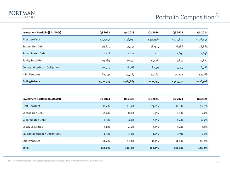 (1) Portfolio Composition Investment Portfolio ($ in ‘000s) Q3 2023 Q4 2023 Q1 2024 Q2 2024 Q3 2024 First Lien Debt $357,451 $336,599 $345,978 $320,815 $316,444 Second Lien Debt 49,825 41,254 38,925 36,386 28,885 Subordinated Debt 1298 1,224 1211 1,693 1,696 Equity Securities 19,189 20,533 23,428 23,830 22,879 Collateralized Loan Obligations 10,425 8,968 8,549 7,354 6,786 Joint Ventures 62,231 59,287 53,164 54,292 52,288 Ending Balance $500,419 $467,865 $471,255 $444,370 $428,978 Investment Portfolio (% of total) Q3 2023 Q4 2023 Q1 2024 Q2 2024 Q3 2024 First Lien Debt 71.4% 71.9% 73.4% 72.1% 73.8% Second Lien Debt 10.0% 8.8% 8.3% 8.2% 6.7% Subordinated Debt 0.3% 0.3% 0.3% 0.4% 0.4% Equity Securities 3.8% 4.4% 5.0% 5.4% 5.3% Collateralized Loan Obligations 2.1% 1.9% 1.8% 1.7% 1.6% Joint Ventures 12.4% 12.7% 11.3% 12.2% 12.2% Total 100.0% 100.0% 100.0% 100.0% 100.0% (1) At Fair Value at the end of the respective period. Does not include activity in short-term investments and derivatives. 12