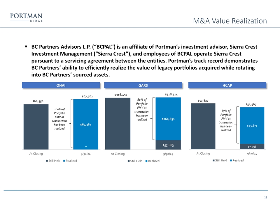 M&A Value Realization § BC Partners Advisors L.P. (“BCPAL”) is an affiliate of Portman’s investment advisor, Sierra Crest Investment Management (“Sierra Crest”), and employees of BCPAL operate Sierra Crest pursuant to a servicing agreement between the entities. Portman’s track record demonstrates BC Partners’ ability to efficiently realize the value of legacy portfolios acquired while rotating into BC Partners’ sourced assets. OHAI GARS HCAP $318,514 $316,452 $67,362 81% of $57,827 $60,550 Portfolio $52,967 FMV at 100% of 87% of transaction Portfolio Portfolio has been FMV at $260,831 FMV at realized transaction transaction has been $67,362 $45,871 has been realized realized $57,683 – $7,096 At Closing 9/30/24 At Closing 9/30/24 At Closing 9/30/24 Still Held Realized Still Held Realized Still Held Realized 13