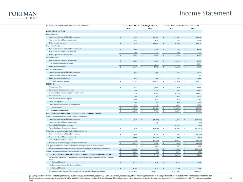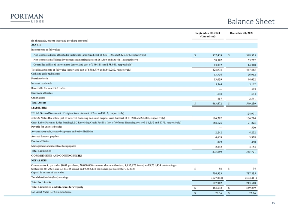 Balance Sheet September 30, 2024 December 31, 2023 (Unaudited) (in thousands, except share and per share amounts) ASSETS Investments at fair value: Non-controlled/non-affiliated investments (amortized cost of $391,156 and $426,630, respectively) $ 357,459 $ 398,325 Non-controlled affiliated investments (amortized cost of $61,805 and $55,611, respectively) 58,507 55,222 Controlled affiliated investments (amortized cost of $49,818 and $58,041, respectively) 13,012 14,318 Total Investments at fair value (amortized cost of $502,779 and $540,282, respectively) 428,978 467,865 Cash and cash equivalents 13,736 26,912 Restricted cash 13,039 44,652 Interest receivable 5,544 5,162 Receivable for unsettled trades — 573 Due from affiliates 1,518 1,534 Other assets 857 2,541 Total Assets $ 463,672 $ 549,239 LIABILITIES 2018-2 Secured Notes (net of original issue discount of $— and $712, respectively) — 124,971 4.875% Notes Due 2026 (net of deferred financing costs and original issue discount of $1,208 and $1,786, respectively) 106,792 106,214 Great Lakes Portman Ridge Funding LLC Revolving Credit Facility (net of deferred financing costs of $1,352 and $775, respectively) 158,126 91,225 Payable for unsettled trades — 520 Accounts payable, accrued expenses and other liabilities 2,242 4,252 Accrued interest payable 4,659 3,928 Due to affiliates 1,029 458 Management and incentive fees payable 2,842 4,153 Total Liabilities 275,690 335,721 CO MMITMENTS AND CO NTINGENCIES NET ASSETS Common stock, par value $0.01 per share, 20,000,000 common shares authorized; 9,955,873 issued, and 9,231,454 outstanding at $ 92 $ 94 September 30, 2024, and 9,943,385 issued, and 9,383,132 outstanding at December 31, 2023 Capital in excess of par value 714,933 717,835 Total distributable (loss) earnings (527,043) (504,411) Total Net Assets 187,982 213,518 Total Liabilities and Stockholders' Equity $ 463,672 $ 549,239 Net Asset Value Per Common Share $ 20.36 $ 22.76 15
