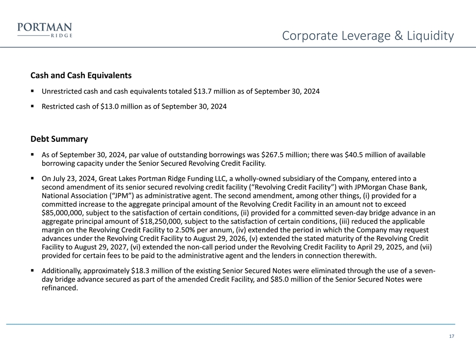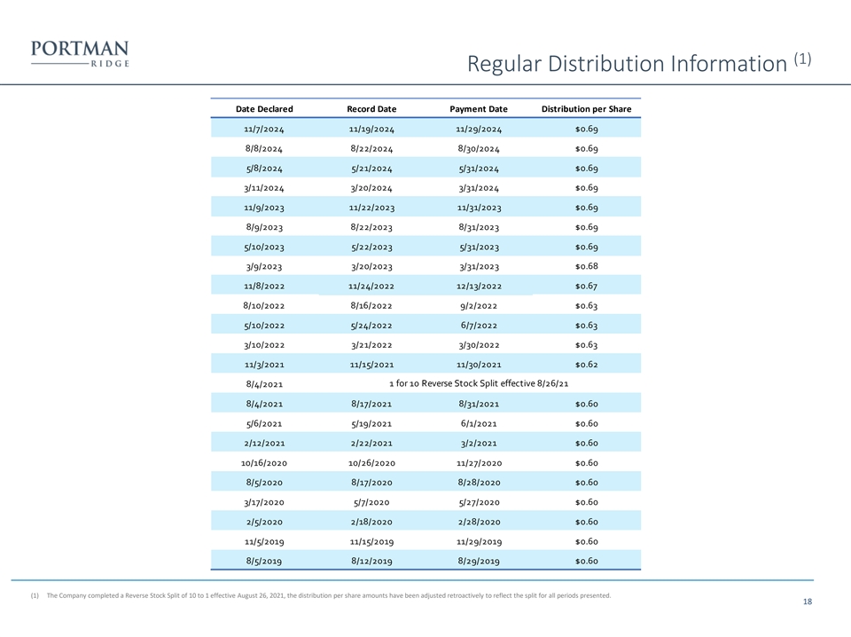 Corporate Leverage & Liquidity Cash and Cash Equivalents § Unrestricted cash and cash equivalents totaled $13.7 million as of September 30, 2024 § Restricted cash of $13.0 million as of September 30, 2024 Debt Summary § As of September 30, 2024, par value of outstanding borrowings was $267.5 million; there was $40.5 million of available borrowing capacity under the Senior Secured Revolving Credit Facility. § On July 23, 2024, Great Lakes Portman Ridge Funding LLC, a wholly-owned subsidiary of the Company, entered into a second amendment of its senior secured revolving credit facility (“Revolving Credit Facility”) with JPMorgan Chase Bank, National Association (“JPM”) as administrative agent. The second amendment, among other things, (i) provided for a committed increase to the aggregate principal amount of the Revolving Credit Facility in an amount not to exceed $85,000,000, subject to the satisfaction of certain conditions, (ii) provided for a committed seven-day bridge advance in an aggregate principal amount of $18,250,000, subject to the satisfaction of certain conditions, (iii) reduced the applicable margin on the Revolving Credit Facility to 2.50% per annum, (iv) extended the period in which the Company may request advances under the Revolving Credit Facility to August 29, 2026, (v) extended the stated maturity of the Revolving Credit Facility to August 29, 2027, (vi) extended the non-call period under the Revolving Credit Facility to April 29, 2025, and (vii) provided for certain fees to be paid to the administrative agent and the lenders in connection therewith. § Additionally, approximately $18.3 million of the existing Senior Secured Notes were eliminated through the use of a seven- day bridge advance secured as part of the amended Credit Facility, and $85.0 million of the Senior Secured Notes were refinanced. 17