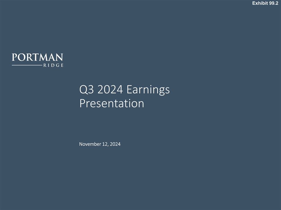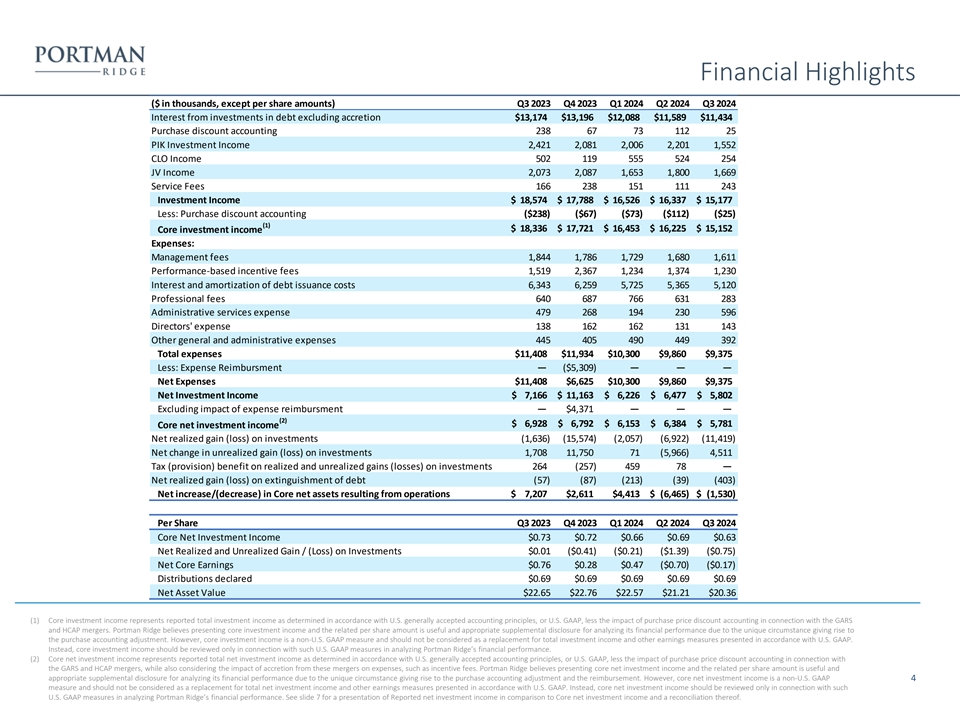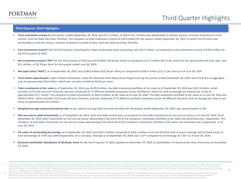 Third Quarter Highlights Third Quarter 2024 Highlights § Total investment income for the quarter ended September 30, 2024, was $15.2 million, of which $12.7 million was attributable to interest income, inclusive of payment-in-kind income, from the Debt Securities Portfolio. This compares to total investment income of $18.6 million for the quarter ended September 30, 2023, of which $15.8 million was attributable to interest income, inclusive of payment-in-kind income, from the Debt Securities Portfolio. (1) § Core investment income for the third quarter, excluding the impact of purchase price accounting, was $15.2 million, as compared to core investment income of $18.3 million for the third quarter of 2023. § Net investment income ( NII ) for the third quarter of 2024 was $5.8 million ($0.63 per share) as compared to $7.2 million ($0.75 per share) for the same period the prior year, and $6.5 million, or $0.70 per share for the quarter ended June 30, 2024. § Net asset value (“NAV”) as of September 30, 2024, was $188.0 million ($20.36 per share) as compared to $196.4 million ($21.21 per share) as of June 30, 2024. § Total shares repurchased in open market transactions under the Renewed Stock Repurchase Program during the quarter ended September 30, 2024, were 33,429 at an aggregate cost of approximately $0.6 million, which was accretive to NAV by $0.01 per share. § Total investments at fair value as of September 30, 2024, was $429.0 million; the debt investment portfolio at fair value as of September 30, 2024 was $347.0 million, which excludes CLO Funds and Joint Ventures, and was comprised of 72 different portfolio companies across 28 different industries with an average par balance per entity of approximately $2.7 million. This compares to total investments of $444.4 million at fair value as of June 30, 2024. The debt investment portfolio at fair value as of June 30, 2024 was $358.9 million, which excludes CLO Funds and Joint Ventures, and was comprised of 75 different portfolio companies across 28 different industries with an average par balance per entity of approximately $2.6 million. § Weighted average contractual interest rate on our interest earning Debt Securities Portfolio for the quarter ended September 30, 2024, was approximately 11.9%. § Non-accruals on debt investments, as of September 30, 2024, were nine debt investments as compared to nine debt investments on non-accrual status as of June 30, 2024. As of September 30, 2024, debt investments on non-accrual status represented 1.6% and 4.5% of the Company’s investment portfolio at fair value and amortized cost, respectively. This compares to nine debt investments on non-accrual status representing 0.5% and 4.5% of the Company’s investment portfolio at fair value and amortized cost, respectively, as of June 30, 2024. § Par value of outstanding borrowings, as of September 30, 2024, was $267.5 million compared to $285.1 million as of June 30,2024, with an asset coverage ratio of total assets to (2) (2) total borrowings of 170% and 169% respectively. On a net basis, leverage as of September 30, 2024, was 1.3x compared to net leverage of 1.3x as of June 30, 2024. § Declared stockholder distribution of $0.69 per share for the fourth quarter of 2024, payable on November 29, 2024, to stockholders of record at the close of business on November 19, 2024. (1) Core investment income represents reported total investment income as determined in accordance with U.S. generally accepted accounting principles, or U.S. GAAP, less the impact of purchase price discount accounting in connection with the Garrison Capital Inc. (“GARS”) and Harvest Capital Credit Corporation (“HCAP”) mergers. Portman Ridge believes presenting core investment income and the related per share amount is useful and appropriate supplemental disclosure for analyzing its financial performance due to the unique circumstance giving rise to the purchase accounting adjustment. However, core investment income is a non-U.S. GAAP measure and should not be considered as a replacement for total investment income and other earnings measures presented in accordance with U.S. GAAP. Instead, core investment income should be reviewed only in connection 3 with such U.S. GAAP measures in analyzing Portman Ridge’s financial performance. (2) Net leverage is calculated as the ratio between (A) debt, excluding unamortized debt issuance costs, less available cash and cash equivalents, and restricted cash and (B) NAV. Portman Ridge believes presenting a net leverage ratio is useful and appropriate supplemental disclosure because it reflects the Company’s financial condition net of $26.8 million and $36.6 million of cash and cash equivalents and restricted cash as of September 30, 2024 and June 30, 2024, respectively. However, the net leverage ratio is a non-U.S. GAAP measure and should not be considered as a replacement for the regulatory asset coverage ratio and other similar information presented in accordance with U.S. GAAP. Instead, the net leverage ratio should be reviewed only in connection with such U.S. GAAP measures in analyzing Portman Ridge’s financial condition.