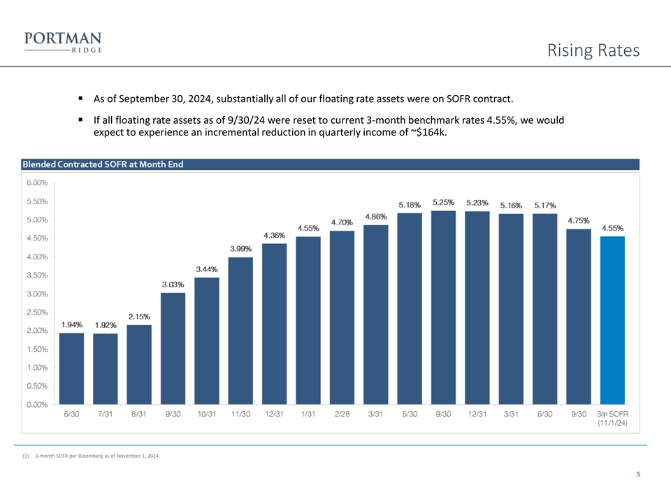 Financial Highlights ($ in thousands, except per share amounts) Q3 2023 Q4 2023 Q1 2024 Q2 2024 Q3 2024 Interest from investments in debt excluding accretion $13,174 $13,196 $12,088 $11,589 $11,434 Purchase discount accounting 238 67 73 112 25 PIK Investment Income 2,421 2,081 2,006 2,201 1,552 CLO Income 502 119 555 524 254 JV Income 2,073 2,087 1,653 1,800 1,669 Service Fees 166 238 151 111 243 Investment Income $ 1 8,574 $ 1 7,788 $ 1 6,526 $ 1 6,337 $ 1 5,177 Less: Purchase discount accounting ($238) ($67) ($73) ($112) ($25) (1) $ 1 8,336 $ 1 7,721 $ 1 6,453 $ 1 6,225 $ 1 5,152 Core investment income Expenses: Management fees 1,844 1,786 1,729 1,680 1,611 Performance-based incentive fees 1,519 2,367 1,234 1,374 1,230 Interest and amortization of debt issuance costs 6,343 6,259 5,725 5,365 5,120 Professional fees 640 687 766 631 283 Administrative services expense 479 268 194 230 596 Directors' expense 138 162 162 131 143 Other general and administrative expenses 445 405 490 449 392 Total expenses $11,408 $11,934 $10,300 $9,860 $9,375 Less: Expense Reimbursment — ($5,309) — — — Net Expenses $11,408 $6,625 $10,300 $9,860 $9,375 Net Investment Income $ 7 ,166 $ 1 1,163 $ 6 ,226 $ 6 ,477 $ 5 ,802 Excluding impact of expense reimbursment — $4,371 — — — (2) $ 6 ,928 $ 6 ,792 $ 6 ,153 $ 6 ,384 $ 5 ,781 Core net investment income Net realized gain (loss) on investments (1,636) (15,574) (2,057) (6,922) (11,419) Net change in unrealized gain (loss) on investments 1,708 11,750 71 (5,966) 4,511 Tax (provision) benefit on realized and unrealized gains (losses) on investments 264 (257) 459 78 — Net realized gain (loss) on extinguishment of debt (57) (87) (213) (39) (403) Net increase/(decrease) in Core net assets resulting from operations $ 7,207 $2,611 $4,413 $ (6,465) $ (1,530) Per Share Q3 2023 Q4 2023 Q1 2024 Q2 2024 Q3 2024 Core Net Investment Income $0.73 $0.72 $0.66 $0.69 $0.63 Net Realized and Unrealized Gain / (Loss) on Investments $0.01 ($0.41) ($0.21) ($1.39) ($0.75) Net Core Earnings $0.76 $0.28 $0.47 ($0.70) ($0.17) Distributions declared $0.69 $0.69 $0.69 $0.69 $0.69 Net Asset Value $22.65 $22.76 $22.57 $21.21 $20.36 (1) Core investment income represents reported total investment income as determined in accordance with U.S. generally accepted accounting principles, or U.S. GAAP, less the impact of purchase price discount accounting in connection with the GARS and HCAP mergers. Portman Ridge believes presenting core investment income and the related per share amount is useful and appropriate supplemental disclosure for analyzing its financial performance due to the unique circumstance giving rise to the purchase accounting adjustment. However, core investment income is a non-U.S. GAAP measure and should not be considered as a replacement for total investment income and other earnings measures presented in accordance with U.S. GAAP. Instead, core investment income should be reviewed only in connection with such U.S. GAAP measures in analyzing Portman Ridge’s financial performance. (2) Core net investment income represents reported total net investment income as determined in accordance with U.S. generally accepted accounting principles, or U.S. GAAP, less the impact of purchase price discount accounting in connection with the GARS and HCAP mergers, while also considering the impact of accretion from these mergers on expenses, such as incentive fees. Portman Ridge believes presenting core net investment income and the related per share amount is useful and appropriate supplemental disclosure for analyzing its financial performance due to the unique circumstance giving rise to the purchase accounting adjustment and the reimbursement. However, core net investment income is a non-U.S. GAAP 4 measure and should not be considered as a replacement for total net investment income and other earnings measures presented in accordance with U.S. GAAP. Instead, core net investment income should be reviewed only in connection with such U.S. GAAP measures in analyzing Portman Ridge’s financial performance. See slide 7 for a presentation of Reported net investment income in comparison to Core net investment income and a reconciliation thereof.