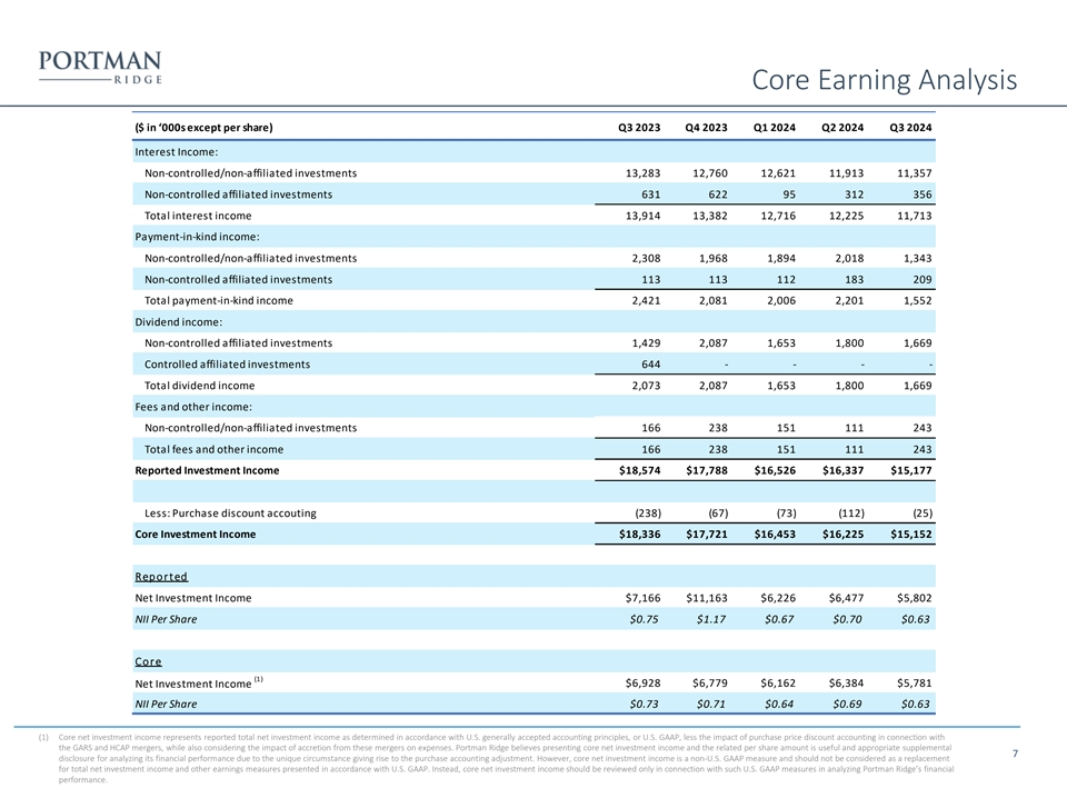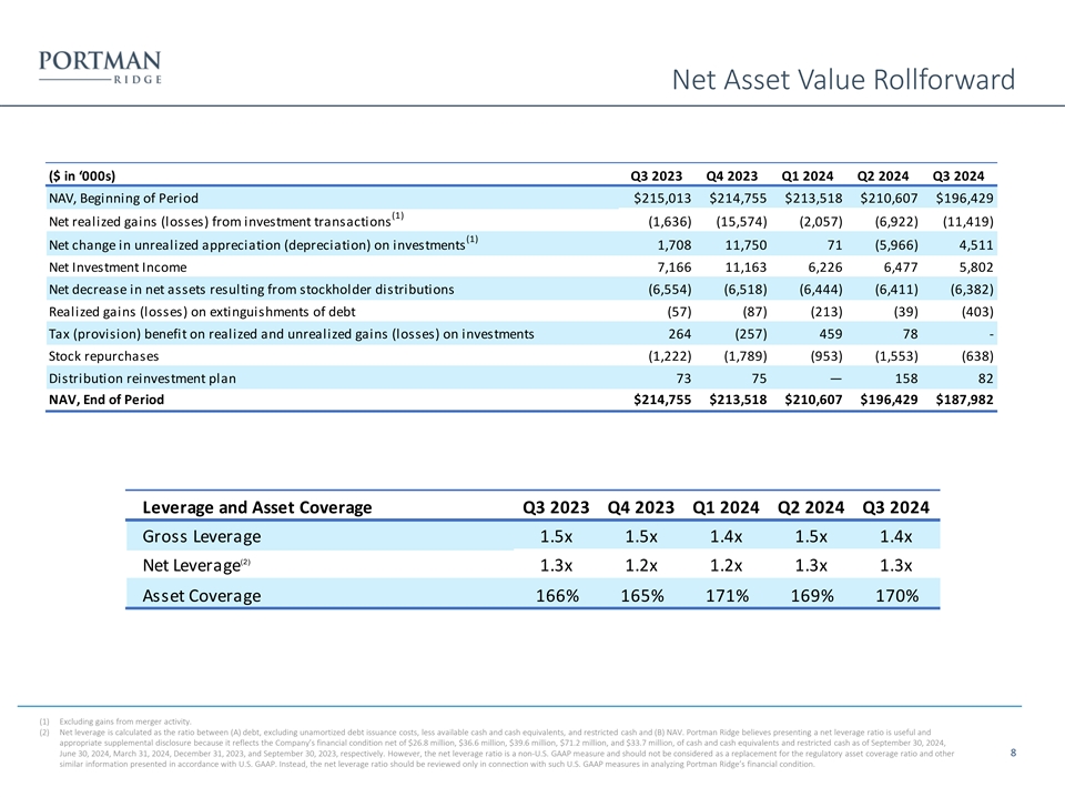 Core Earning Analysis ($ in ‘000s except per share) Q3 2023 Q4 2023 Q1 2024 Q2 2024 Q3 2024 Interest Income: Non-controlled/non-affiliated investments 13,283 12,760 12,621 11,913 11,357 Non-controlled affiliated investments 631 622 95 312 356 Total interest income 13,914 13,382 12,716 12,225 11,713 Payment-in-kind income: Non-controlled/non-affiliated investments 2,308 1,968 1,894 2,018 1,343 Non-controlled affiliated investments 113 113 112 183 209 Total payment-in-kind income 2,421 2,081 2,006 2,201 1,552 Dividend income: Non-controlled affiliated investments 1,429 2,087 1,653 1,800 1,669 Controlled affiliated investments 644 - - - - Total dividend income 2,073 2,087 1,653 1,800 1,669 Fees and other income: Non-controlled/non-affiliated investments 166 238 151 111 243 Total fees and other income 166 238 151 111 243 Reported Investment Income $18,574 $17,788 $16,526 $16,337 $15,177 Less: Purchase discount accouting (238) (67) (73) (112) (25) Core Investment Income $18,336 $17,721 $16,453 $16,225 $15,152 Rep o rted Net Investment Income $7,166 $11,163 $6,226 $6,477 $5,802 NII Per Share $0.75 $1.17 $0.67 $0.70 $0.63 Co re (1) $6,928 $6,779 $6,162 $6,384 $5,781 Net Investment Income NII Per Share $0.73 $0.71 $0.64 $0.69 $0.63 (1) Core net investment income represents reported total net investment income as determined in accordance with U.S. generally accepted accounting principles, or U.S. GAAP, less the impact of purchase price discount accounting in connection with the GARS and HCAP mergers, while also considering the impact of accretion from these mergers on expenses. Portman Ridge believes presenting core net investment income and the related per share amount is useful and appropriate supplemental 7 disclosure for analyzing its financial performance due to the unique circumstance giving rise to the purchase accounting adjustment. However, core net investment income is a non-U.S. GAAP measure and should not be considered as a replacement for total net investment income and other earnings measures presented in accordance with U.S. GAAP. Instead, core net investment income should be reviewed only in connection with such U.S. GAAP measures in analyzing Portman Ridge’s financial performance.