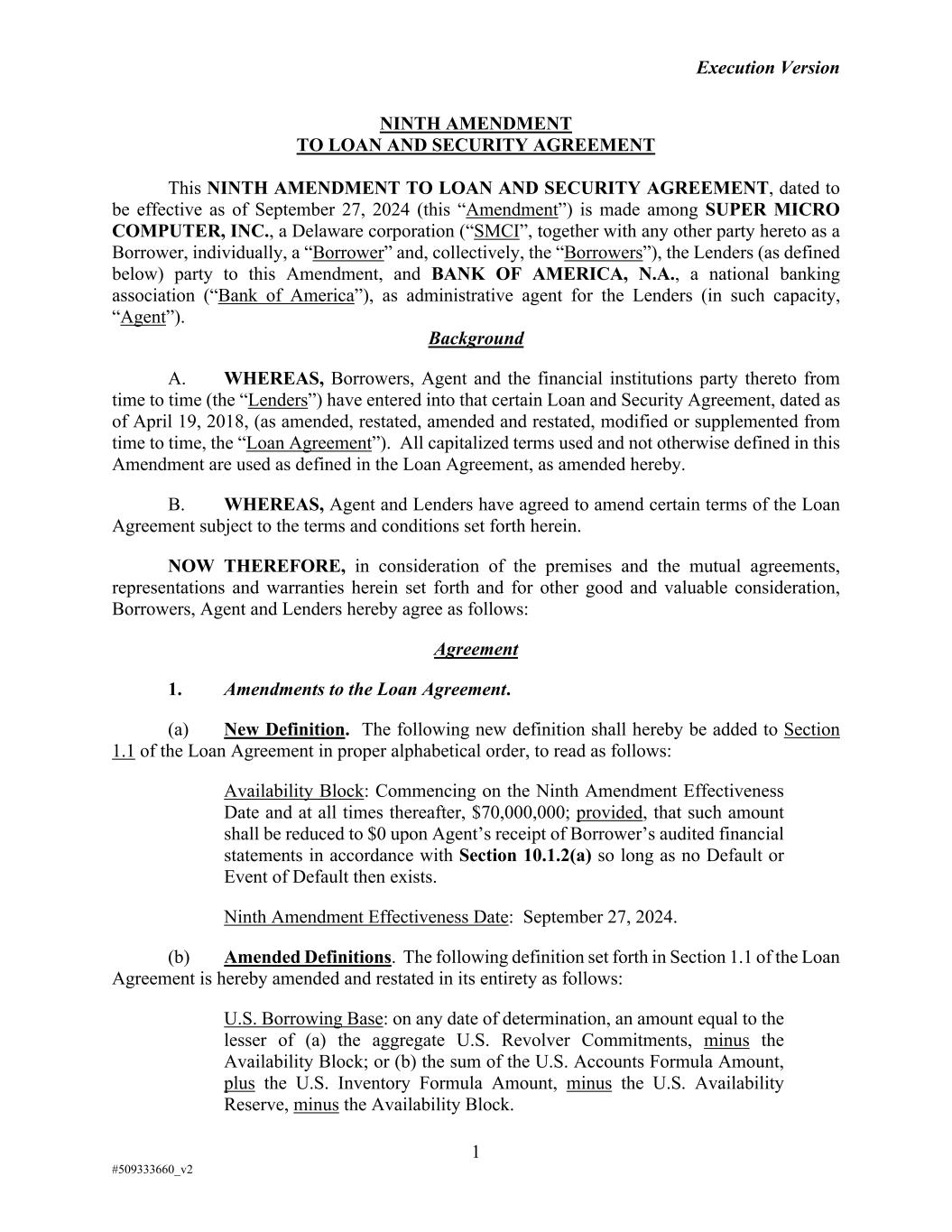 Execution Version 1 #509333660_v2 NINTH AMENDMENT TO LOAN AND SECURITY AGREEMENT This NINTH AMENDMENT TO LOAN AND SECURITY AGREEMENT, dated to be effective as of September 27, 2024 (this “Amendment”) is made among SUPER MICRO COMPUTER, INC., a Delaware corporation (“SMCI”, together with any other party hereto as a Borrower, individually, a “Borrower” and, collectively, the “Borrowers”), the Lenders (as defined below) party to this Amendment, and BANK OF AMERICA, N.A., a national banking association (“Bank of America”), as administrative agent for the Lenders (in such capacity, “Agent”). Background A. WHEREAS, Borrowers, Agent and the financial institutions party thereto from time to time (the “Lenders”) have entered into that certain Loan and Security Agreement, dated as of April 19, 2018, (as amended, restated, amended and restated, modified or supplemented from time to time, the “Loan Agreement”). All capitalized terms used and not otherwise defined in this Amendment are used as defined in the Loan Agreement, as amended hereby. B. WHEREAS, Agent and Lenders have agreed to amend certain terms of the Loan Agreement subject to the terms and conditions set forth herein. NOW THEREFORE, in consideration of the premises and the mutual agreements, representations and warranties herein set forth and for other good and valuable consideration, Borrowers, Agent and Lenders hereby agree as follows: Agreement 1. Amendments to the Loan Agreement. (a) New Definition. The following new definition shall hereby be added to Section 1.1 of the Loan Agreement in proper alphabetical order, to read as follows: Availability Block: Commencing on the Ninth Amendment Effectiveness Date and at all times thereafter, $70,000,000; provided, that such amount shall be reduced to $0 upon Agent’s receipt of Borrower’s audited financial statements in accordance with Section 10.1.2(a) so long as no Default or Event of Default then exists. Ninth Amendment Effectiveness Date: September 27, 2024. (b) Amended Definitions. The following definition set forth in Section 1.1 of the Loan Agreement is hereby amended and restated in its entirety as follows: U.S. Borrowing Base: on any date of determination, an amount equal to the lesser of (a) the aggregate U.S. Revolver Commitments, minus the Availability Block; or (b) the sum of the U.S. Accounts Formula Amount, plus the U.S. Inventory Formula Amount, minus the U.S. Availability Reserve, minus the Availability Block.
