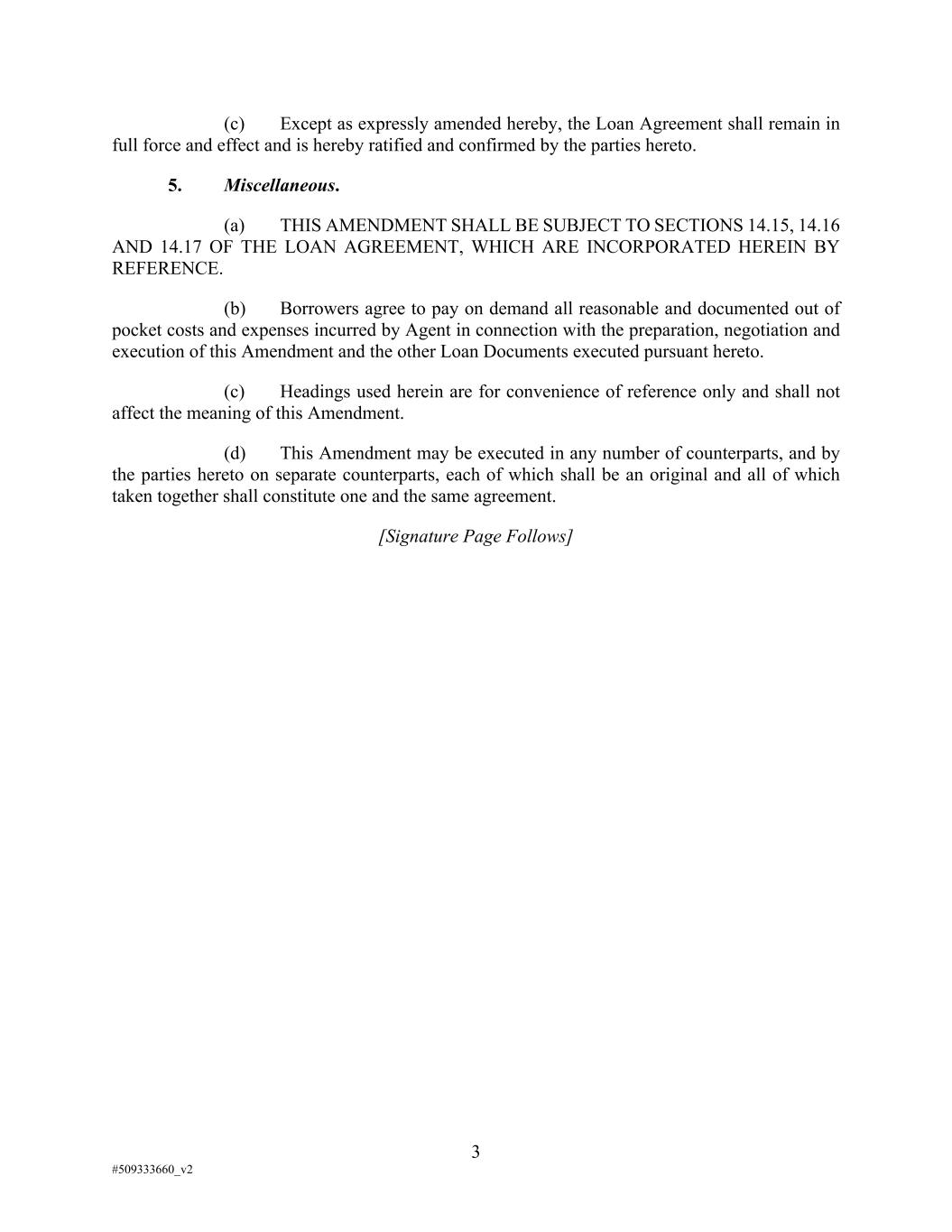 3 #509333660_v2 (c) Except as expressly amended hereby, the Loan Agreement shall remain in full force and effect and is hereby ratified and confirmed by the parties hereto. 5. Miscellaneous. (a) THIS AMENDMENT SHALL BE SUBJECT TO SECTIONS 14.15, 14.16 AND 14.17 OF THE LOAN AGREEMENT, WHICH ARE INCORPORATED HEREIN BY REFERENCE. (b) Borrowers agree to pay on demand all reasonable and documented out of pocket costs and expenses incurred by Agent in connection with the preparation, negotiation and execution of this Amendment and the other Loan Documents executed pursuant hereto. (c) Headings used herein are for convenience of reference only and shall not affect the meaning of this Amendment. (d) This Amendment may be executed in any number of counterparts, and by the parties hereto on separate counterparts, each of which shall be an original and all of which taken together shall constitute one and the same agreement. [Signature Page Follows]