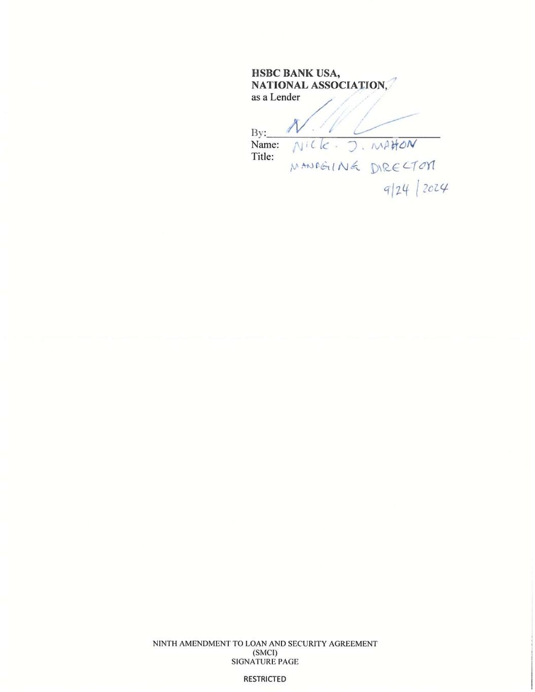 HSBC BANK USA, NATIONAL ASSOCIATION, as a Lender Name: C ic ■ ") Title: NINTH AMENDMENT TO LOAN AND SECURITY AGREEMENT (SMCI) SIGNATURE PAGE RESTRICTED