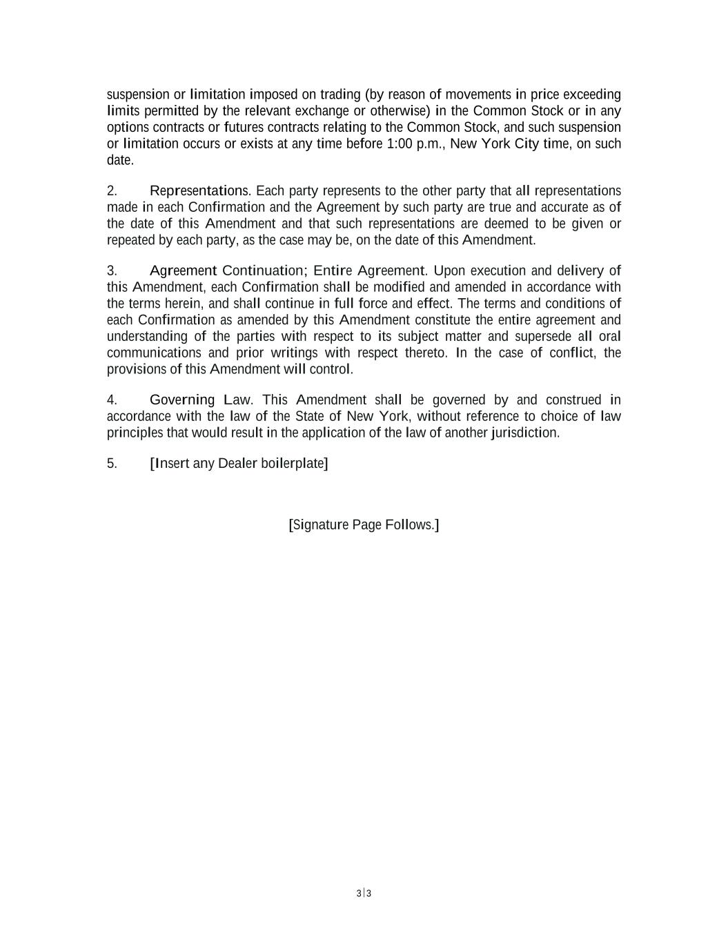 33 suspension or limitation imposed on trading (by reason of movements in price exceeding limits permitted by the relevant exchange or otherwise) in the Common Stock or in any options contracts or futures contracts relating to the Common Stock, and such suspension or limitation occurs or exists at any time before 1:00 p.m., New York City time, on such date. 2. Representations. Each party represents to the other party that all representations made in each Confirmation and the Agreement by such party are true and accurate as of the date of this Amendment and that such representations are deemed to be given or repeated by each party, as the case may be, on the date of this Amendment. 3. Agreement Continuation; Entire Agreement. Upon execution and delivery of this Amendment, each Confirmation shall be modified and amended in accordance with the terms herein, and shall continue in full force and effect. The terms and conditions of each Confirmation as amended by this Amendment constitute the entire agreement and understanding of the parties with respect to its subject matter and supersede all oral communications and prior writings with respect thereto. In the case of conflict, the provisions of this Amendment will control. 4. Governing Law. This Amendment shall be governed by and construed in accordance with the law of the State of New York, without reference to choice of law principles that would result in the application of the law of another jurisdiction. 5. [Insert any Dealer boilerplate] [Signature Page Follows.]